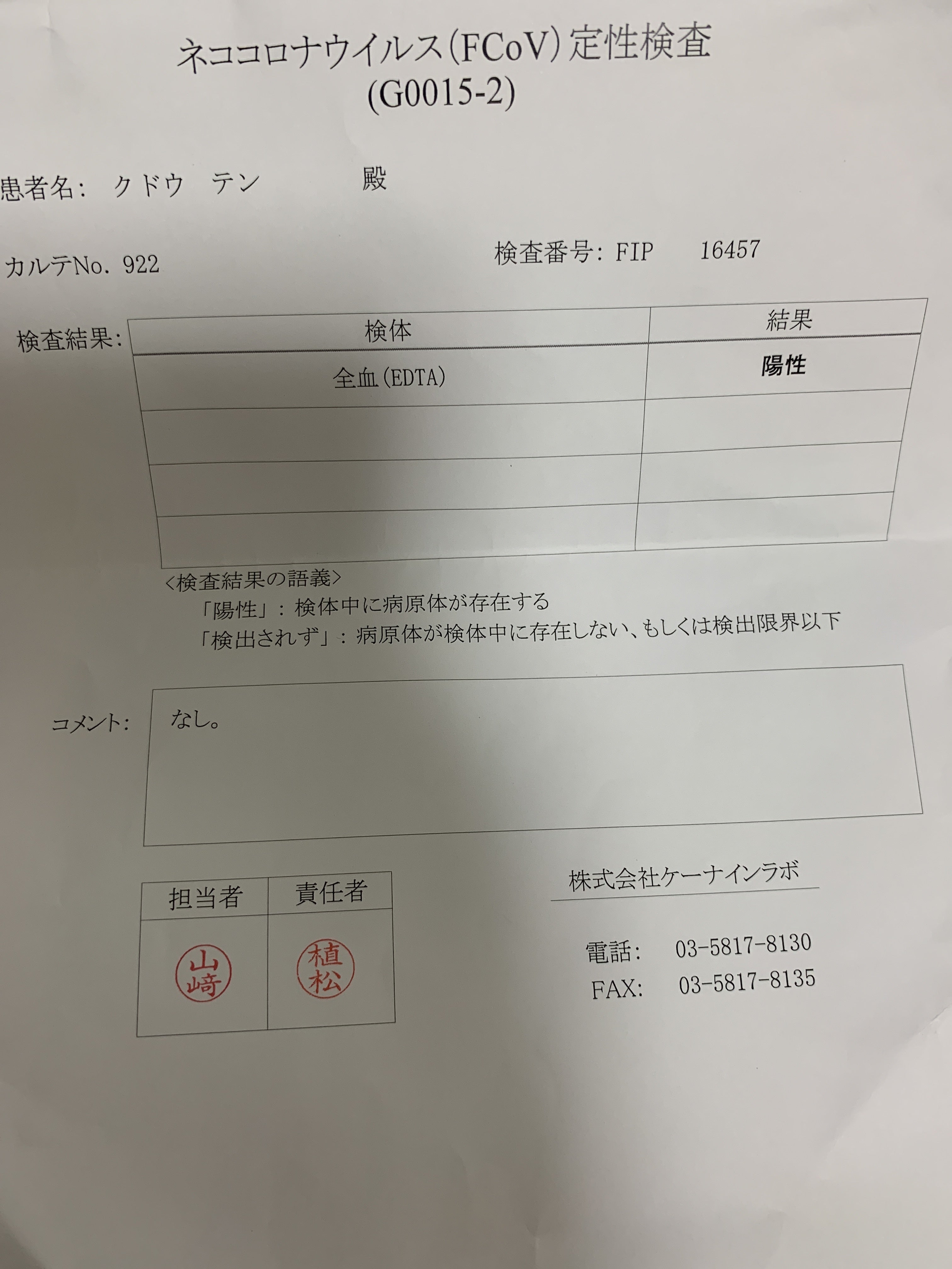 7月28日病院から電話がきてFIP陽性の結果を聞きました。