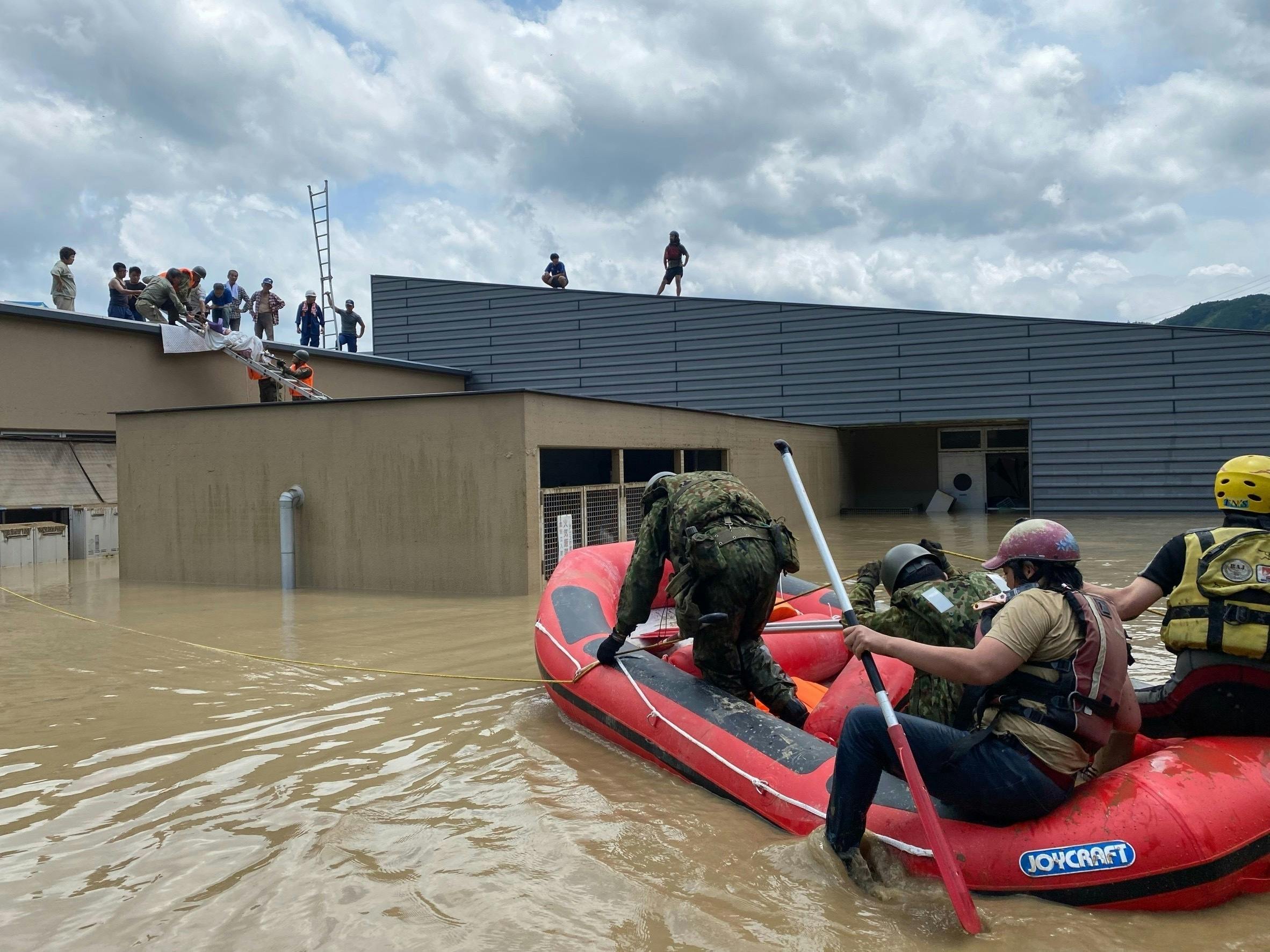 急いで現場へ向かうと、点在する屋根の上で計15名の方が救助を待っている状況でした。