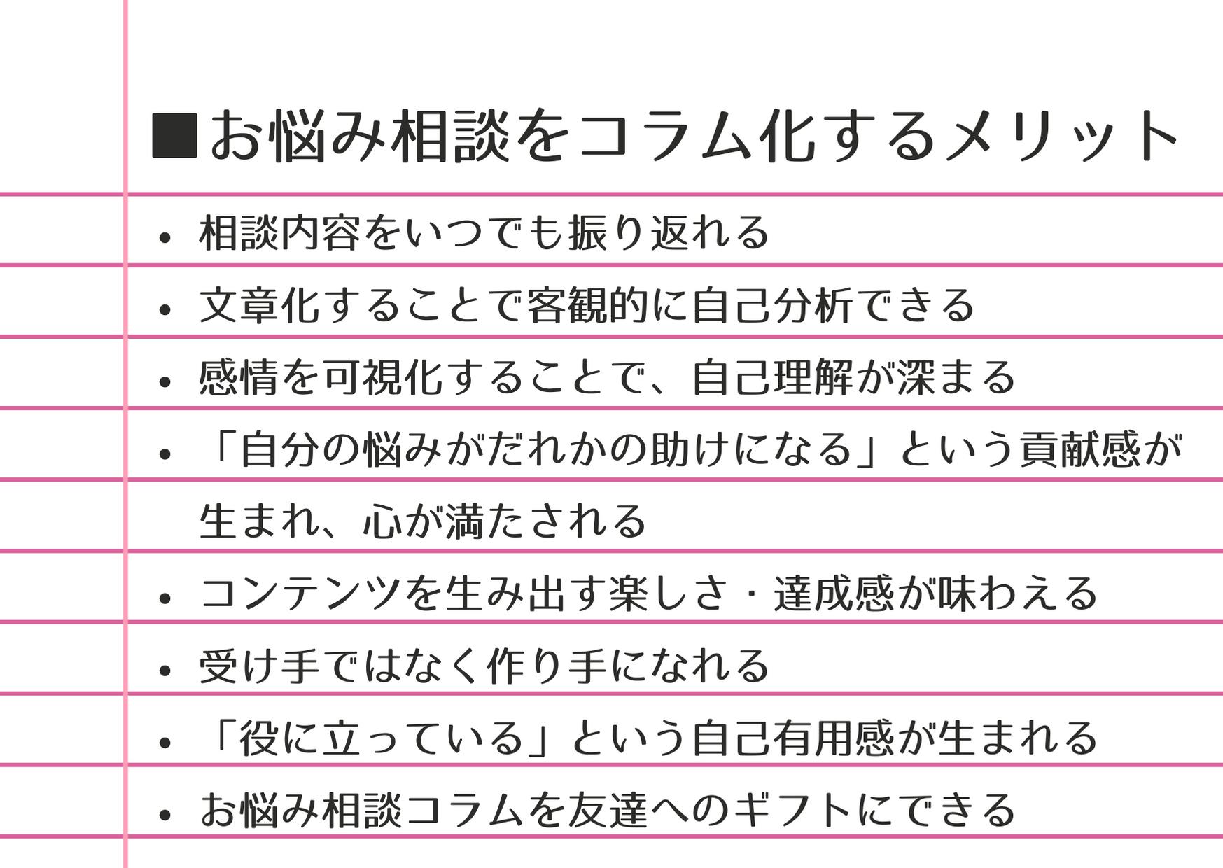 さらにそれをコラム化することで相談できずにいる人の支えにもなれます。人はだれかの役に立った時にもっとも幸せを感じるもの。相談者さん自身が「自分の悩みが人の支えになっている」という喜び(自己有用感)が感じられるので自己肯定感も上がり、みんなが幸せになれます。