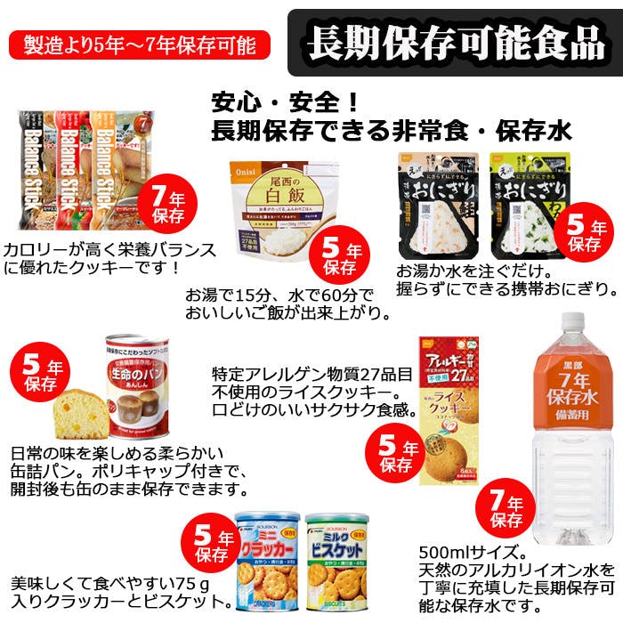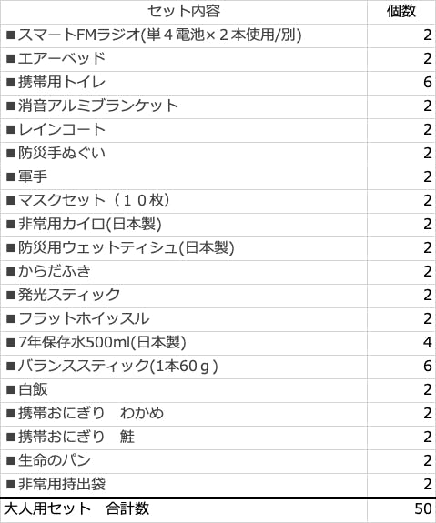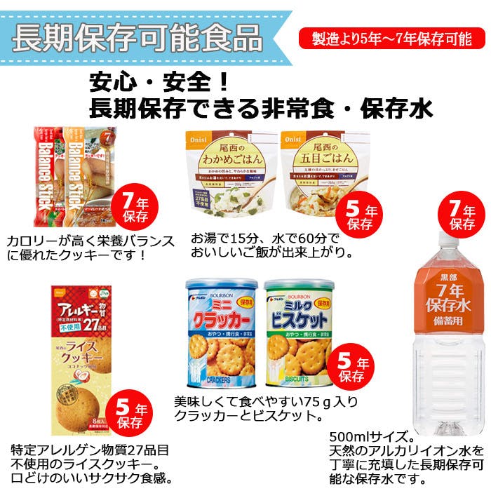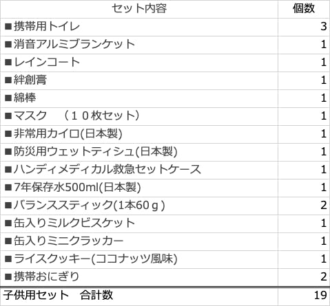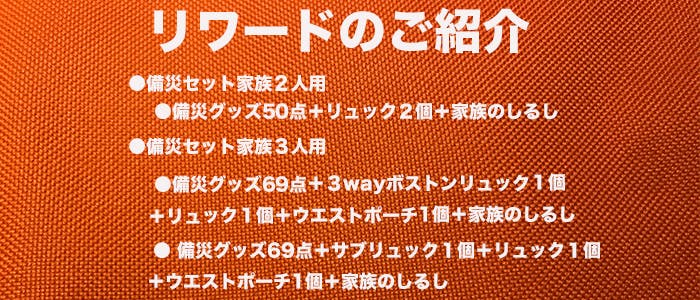 - 備災セット家族2人用 1種類、備災セット家族3人用 2種類は各100個のみの限定の商品になります。この限定数量に関しては「早いもの勝ち」です!