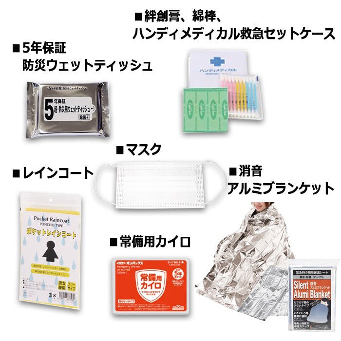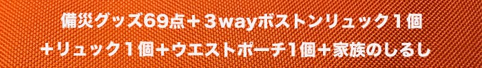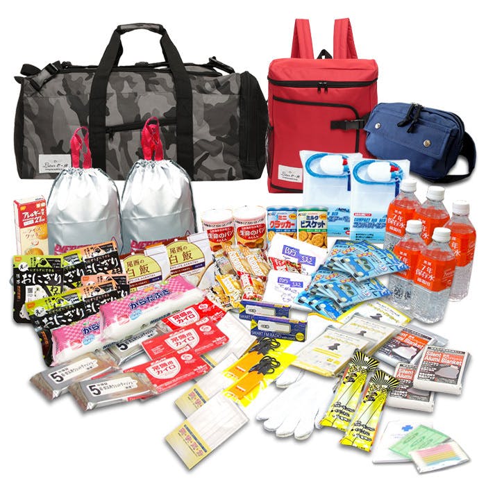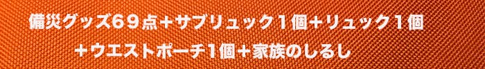 大人2人用防災グッズ50点セットと子供1人用防災グッズ19点セットの合計防災グッズ69点セット+サブリュック(CR-310)1個+リュックサック(CR-307)1個+ウエストバッグ(ネイビー色)1個のセットとなります。
