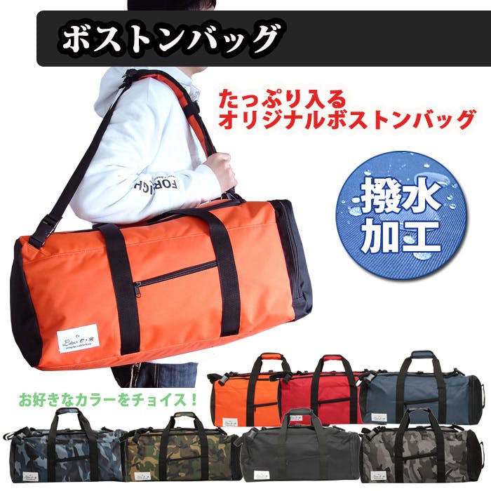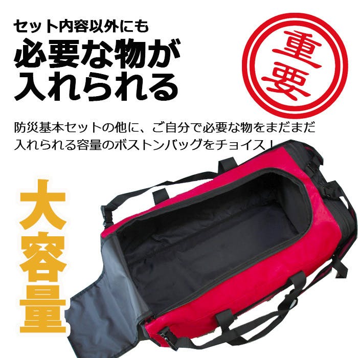 このボストンバッグは、本体に撥水加工が施され、大容量で、防災セットのほかにもまだまだ荷物が入れられる優れものです。
