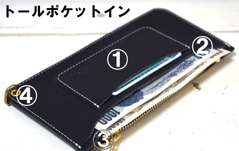 ③TAKOジッパーポケット:トールタイプなのでスマホ・通帳・お札など様々入れる事が可能です。