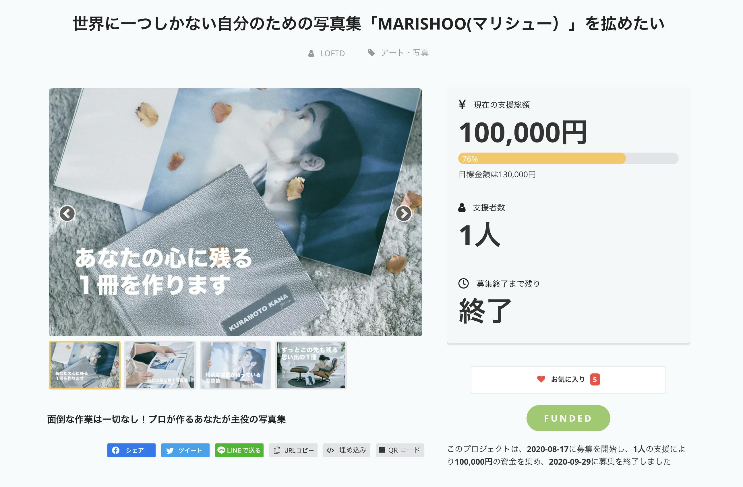 2020/10/07 17:11「世界に一つしかない自分のための写真集「MARISHOO(マリシュー)」を拡めたい」プロジェクトオーナーのLOFT:Dです。ご連絡が遅くなりまして申し訳御座いません。8月17日〜9月29日の約1ヶ月ちょっとの間、CAMPFIRE様で私たちのプロジェクトを立ち上げてから最初は中々支援金が集まらずどうしようかと困っておりましたが、今回ご興味を持ってくださった方からご支援を頂きまして無事にプロジェクトを終える事ができました!目標の支援金額には達成することは残念ながらできませんでしたが、クラウドファンディングを通して色んな地域の方に私たちのプロジェクトを知っていただけた事、私も挑戦してみたいと思ってくださった事が私たちは何より嬉しく思っております。クラウドファンディングについては、今回プロジェクトの支援期間が終了となりましたが引き続きMARISHOOのイベントにつきましては各所で行う予定をしております。詳しくはplay29'sのインスタグラムに情報をアップしていきますので、チェックいただければ嬉しいです♪play29's Instagramこの度は本当に本当に有難う御座いました!!今後とも私たちのMARISHOOを応援いただければ嬉しいです^^* もっと見る
