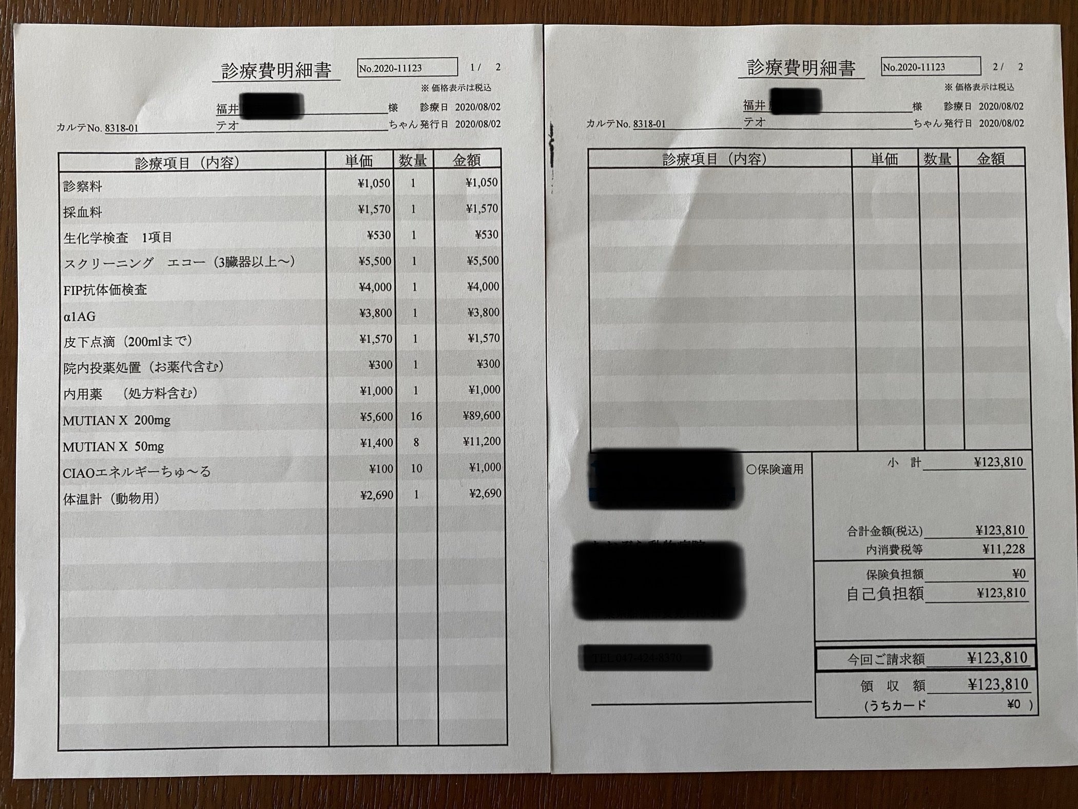 テオ君の体重は現在2.95kgです。投与量は2.83〜3.13kgの場合450mg/日となっています。価格は1,400円/50mgです。テオ君の場合は450mgですから12,600円/日となりこれを84日毎日投与すると、サプリメント代だけでなんと1,058400円掛かります。その他に投与中の検査4回+@と投与終了後の経過観察の検査2回があります。