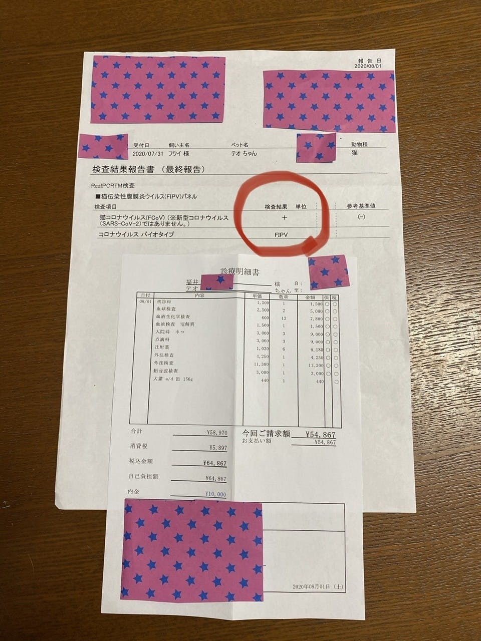 テオがFIPである事の分かる書類(診断書)です。大事なこちらを皆様にお見せするのを忘れておりまた。