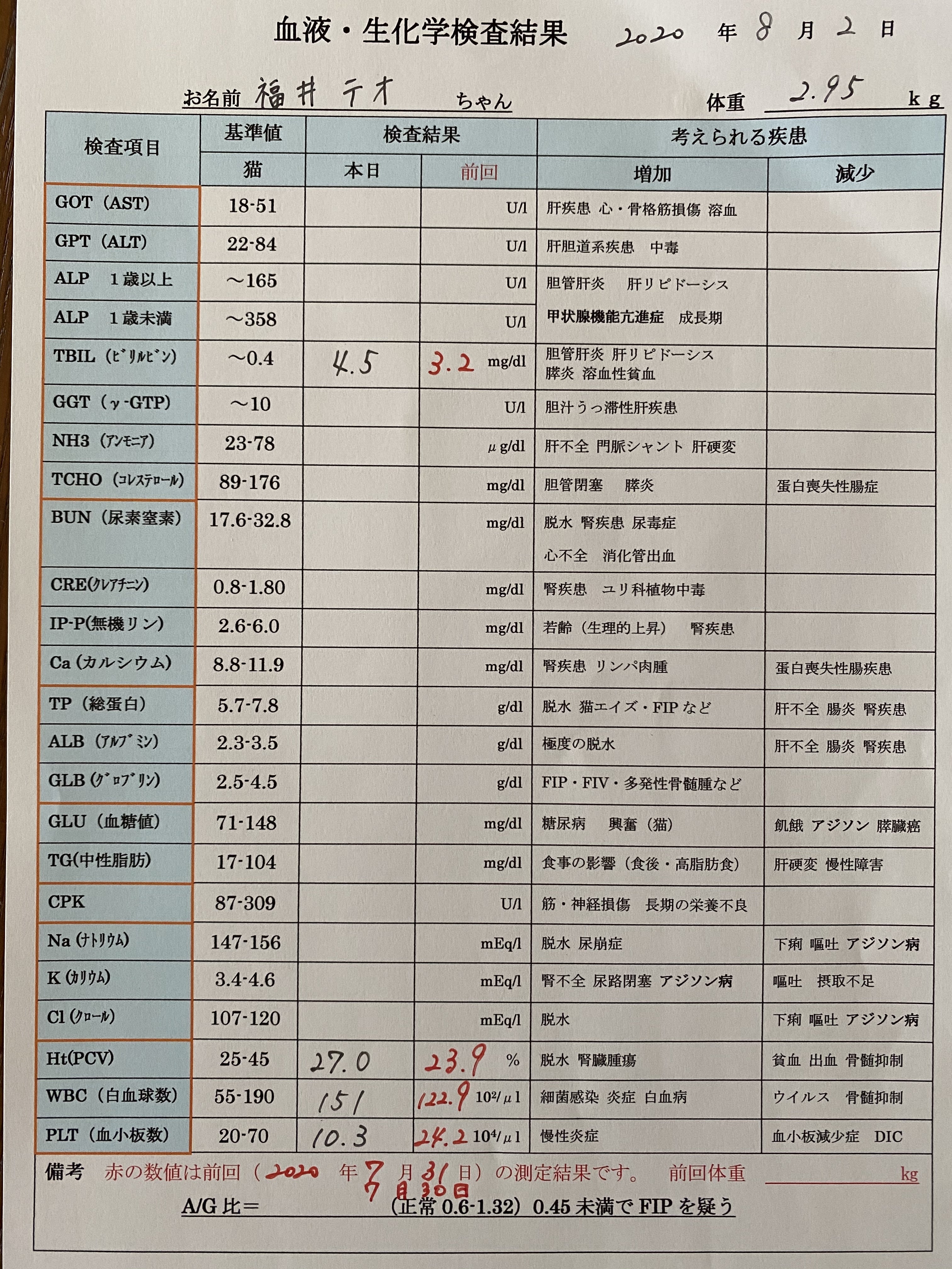 2020/11/27 08:30血液検査の外部機関の結果連絡がありました。AG比0.68との事で低めです。まだ注意が必要となり、発熱が無いかよく見て行かないといけません。便秘の方は調子良い様です。また、何かありましたらご報告します。 もっと見る