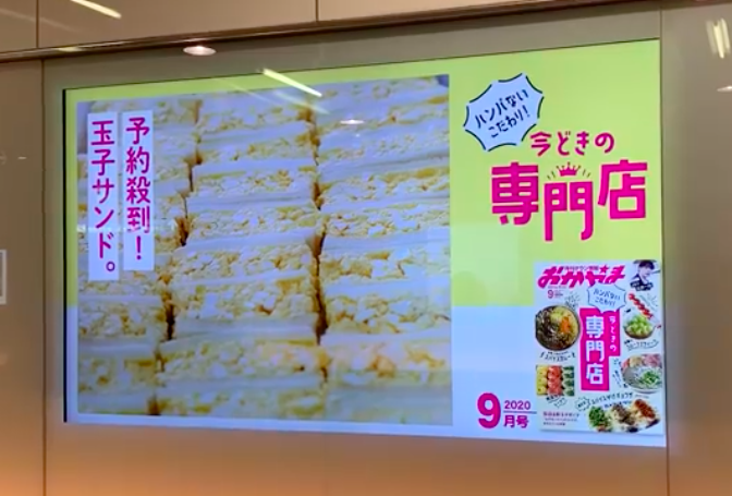 本日より、私阪本の日常を活動報告であげていきます!※不定期です笑 毎日ではありません笑岡山駅付近を歩いていたら、、、たまごサンドの動画広告を発見!岡山駅地下の広告でたまごサンドをご紹介いただいております!駅からイオンに行くまでの地下道です〜〜!最新号のタウン情報おかやま(2020年9月号)にうちのたまごサンドが1ページ余すことなく紹介されています!