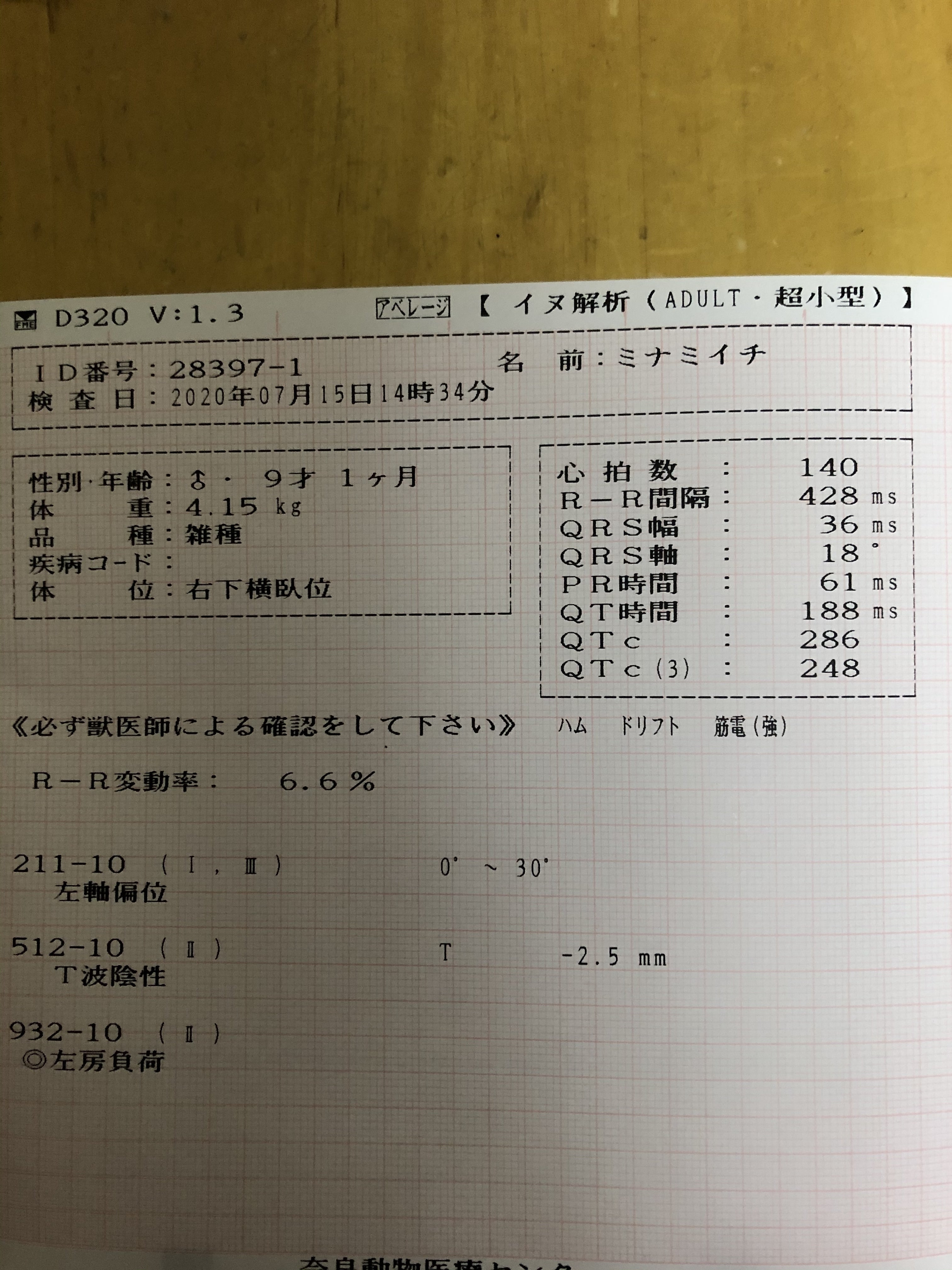 この時モニター心電図、採血、エコー検査、レントゲン撮影、利尿剤と強心剤などを投与しICUで一時的入院となりました。