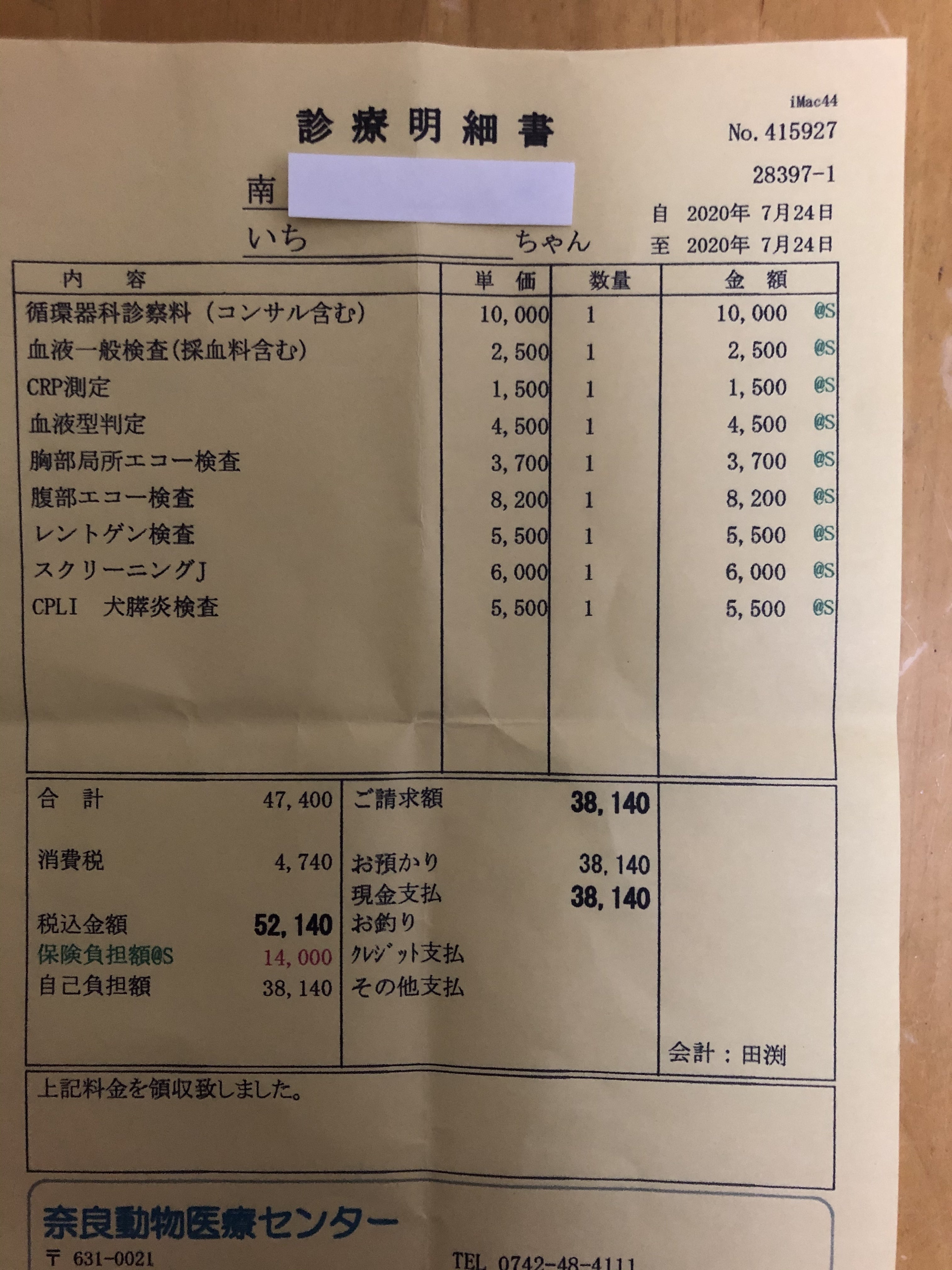 7月24日 循環器科診療、血液一般検査、CRP測定、血液型判定、胸部局所エコー検査、腹部エコー検査、レントゲン検査、CPLI犬膵炎検査などありました。