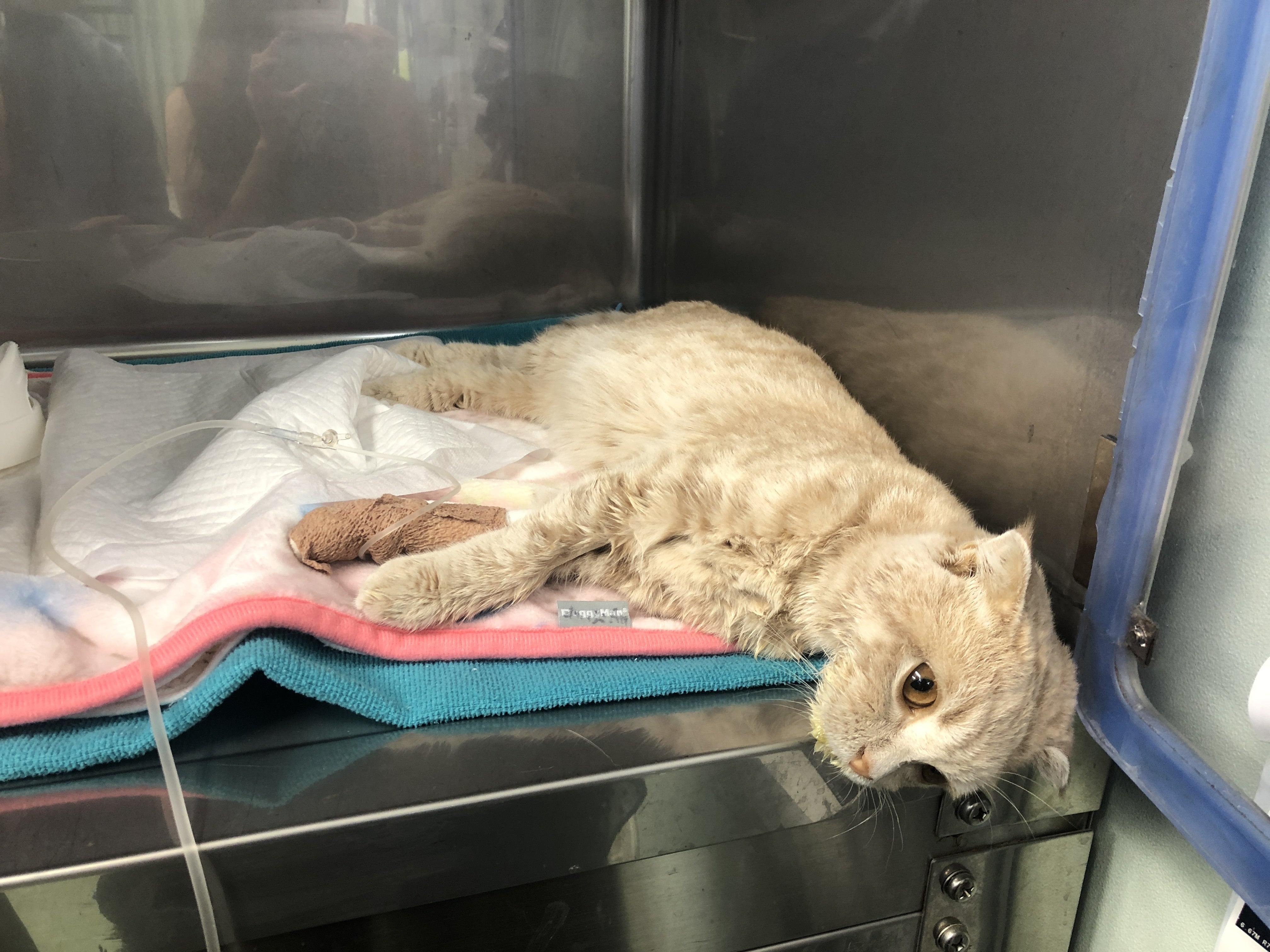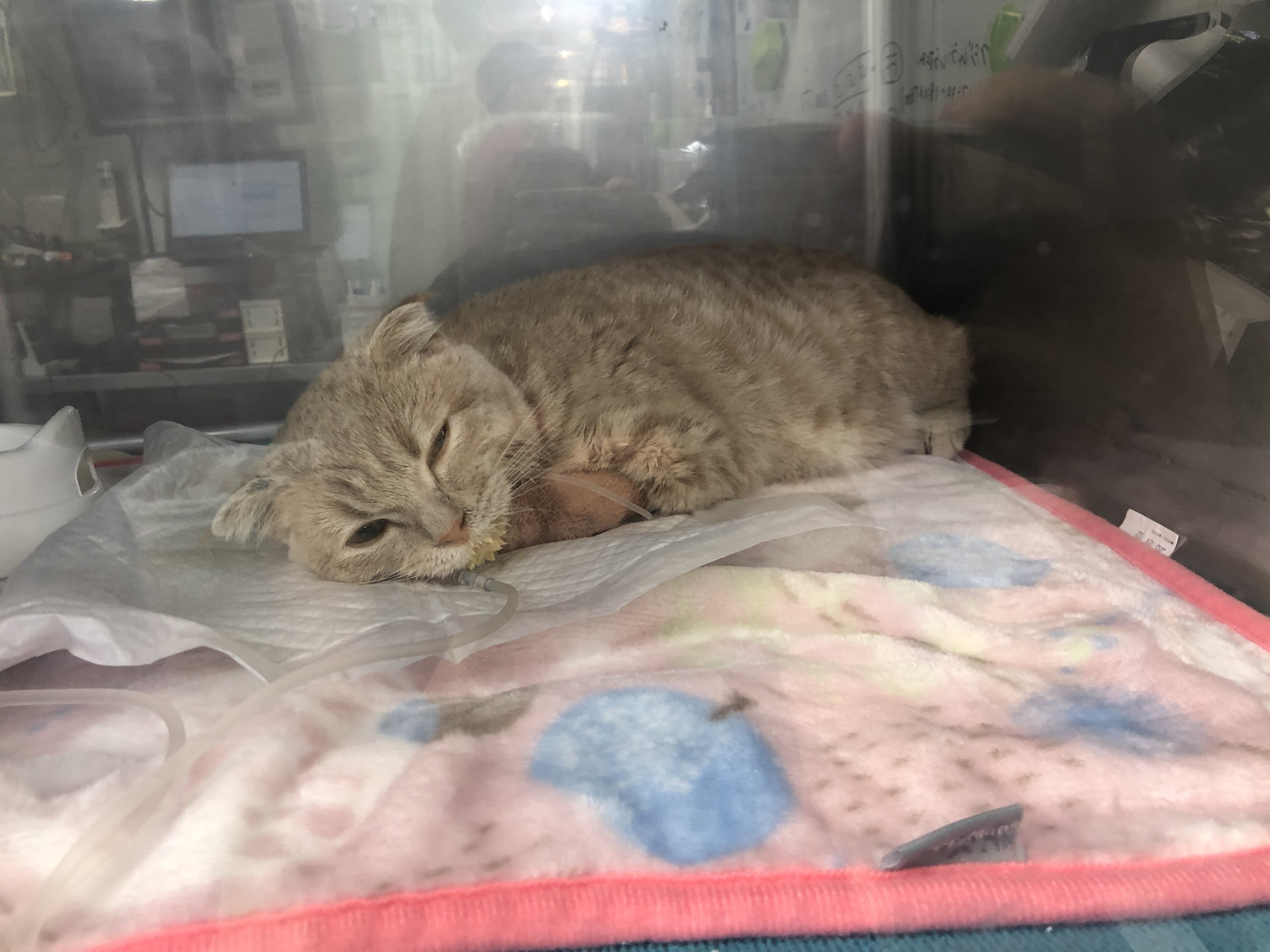 腹水が溜まっていること、重度の脱水症状があること、貧血、発熱(40度以上)などから担当の獣医師さんから『猫伝染性腹膜炎(FIP)』であることが疑われ、「このままでは数日もたないかもしれない」と言われました。明確な治療法はなく延命治療しか出来ないとも言われ、突然のことで困惑しており事実を受け入れるまで多少時間がかかりました。