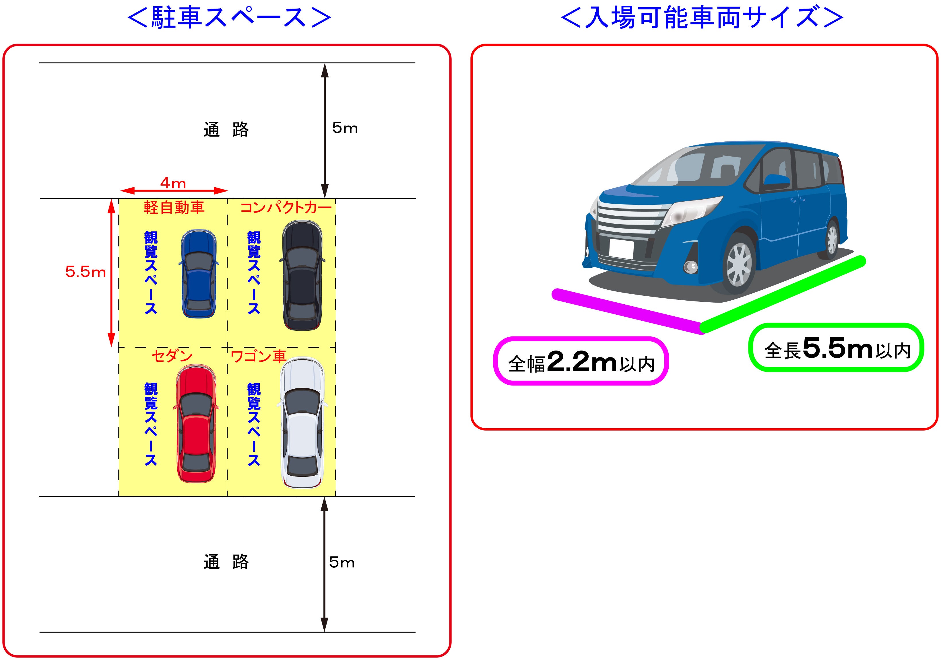 ※ほとんどの軽自動車・普通車は入場可能ですが、事前に車両のサイズをご確認下さい。