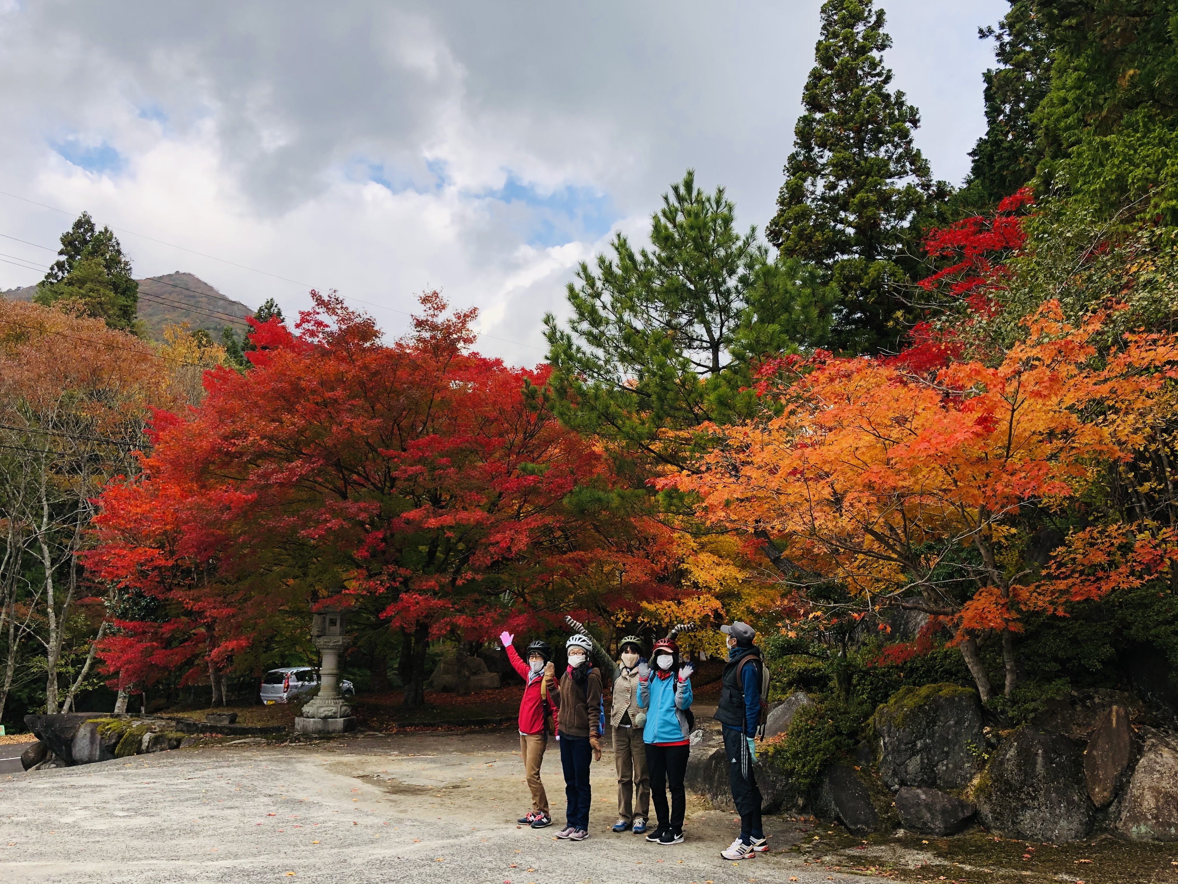 11月3日(火)大朝の紅葉がピークを迎える中、5名の方がツアーに参加してくださいました!最初は暖かかったのですが、後半北風が強く、ちょっと肌寒いツアーとなりました(;^_^Aしかし、雲がなく天気が良すぎると太陽の光で色が飛ぶというか、抜けた感じに見える紅葉もこの日は雲が多く、いい感じだったので赤、黄、緑がとても色濃く際立ってみえました(^^♪大朝駅「O.M.S」からスタート~!田原地区にある田園風景をバックに、せぇ~のぉ~……とうっ!!!と皆さんキレイに飛んでます(^O^)/田園の中を爽快に走ります(^O^)/今はやってないですが、田原温泉前の紅葉もキレイに色付いてます(^^♪熊城山ふもと近くに突如現れる、通称「山おやじ」にびっくりΣ(゚Д゚)!いざ!テングシデまで…ここ、結構な上りですが・・・・・e-bikeならラクラク笑顔で上れます~~(^^♪最近出来たあずまやでティータイム!(^^)!今では観光地となっているテングシデ。かたやひっそりと生き続けている山おやじ・・・過去と現在の物語はツアーの中で・・・西教寺の大銀杏も今が、サイコーで~~~~す!昼食はハーブガーデン天意の里(あいのさと)さんのランチ!(^^)!あらかじめ予約注文しておけば、肉、魚なしのベジハーブランチも作って頂けます!しかし、エビフライはほんまにエビかと思うくらいのしっぽのエビ感!!!そして、何より丁寧でわかりやすいお品書き(^^♪ごちそうさまでした。たいへん美味しゅうございました!ランチとセリフ、いただきましたぁ~。昼食後はハイライトのほとけばら遊園~(^^♪あのモミジはすごいねぇ~!はい、セルフィーー!!と言って撮ったか忘れましたが、最初で最後のセルフィでした。本日ツアーに参加して頂いた皆様、ありがとうございました!