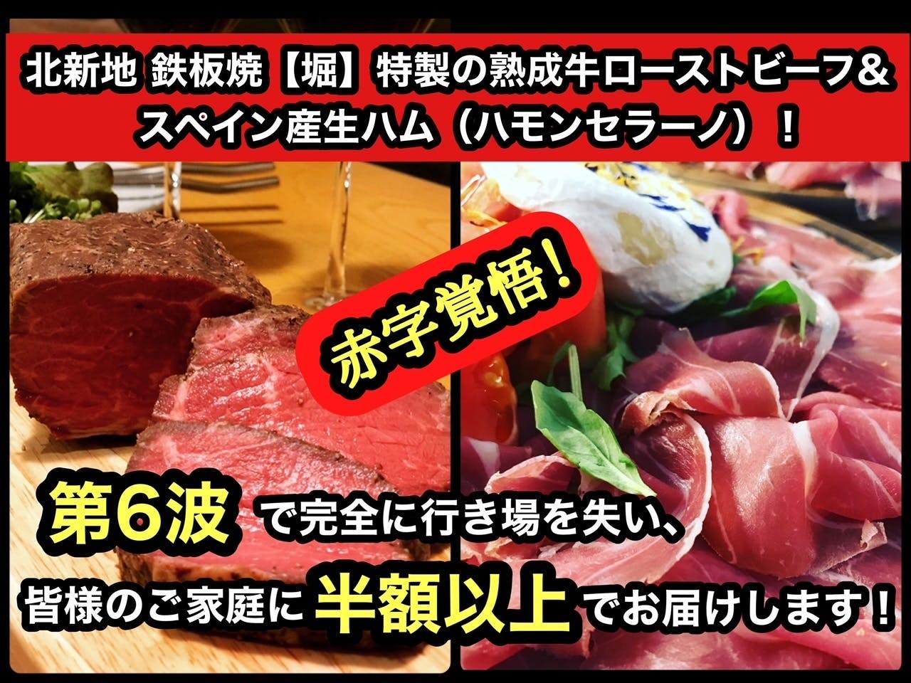 必見!新プロジェクトのお知らせ!!半額以上でお届け!大人気の北新地【堀】熟成牛ローストビーフとスペイン産生ハム!