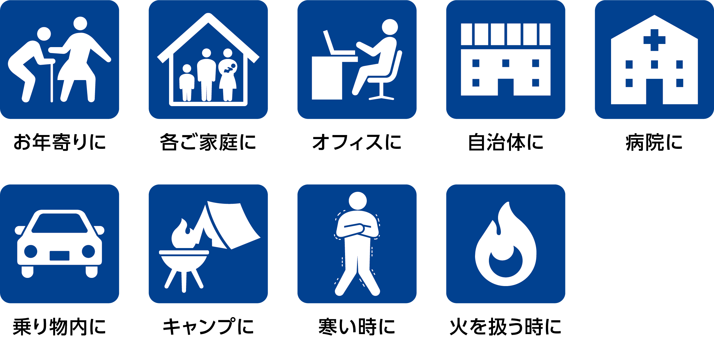 このブランケットがいつでも手元にあれば、とっさの火災でも安心です。時にはアウトドアや、船旅、乗り物内、宿泊先など、さらには離れて暮らすご年配のご両親へ、いつでも安心を手元に置き、あったらよかったと思う防災グッズです。