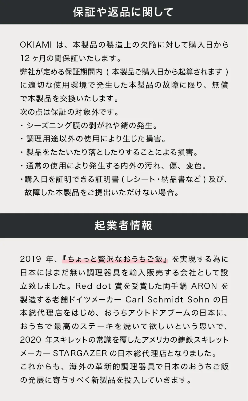 2021/01/13 00:40皆様大変お待たせいたしました。コンテナ船遅延の影響もありましたが本日無事出荷完了致しました。※スキレットレザーハンドルは別口での配送となります。13日発送にて郵送にて届きます。先にスキレット届いた方は少々お待ちください。スキレットはシーズニング済みの為、届きましたらすぐ使用できます。初めのうちは若干油を多めに使用お願い致します。どんどんシーズニング層が厚くなっていきあなただけのスキレットへ仕上がっていきます。フライパンとスキレットで作った料理の旨味の違いをぜひ味わってみてください!この度はご支援頂きまして誠にありがとうございました。引き続きOKIAMI「魔法のスキレット」を宜しくお願い致します。 もっと見る