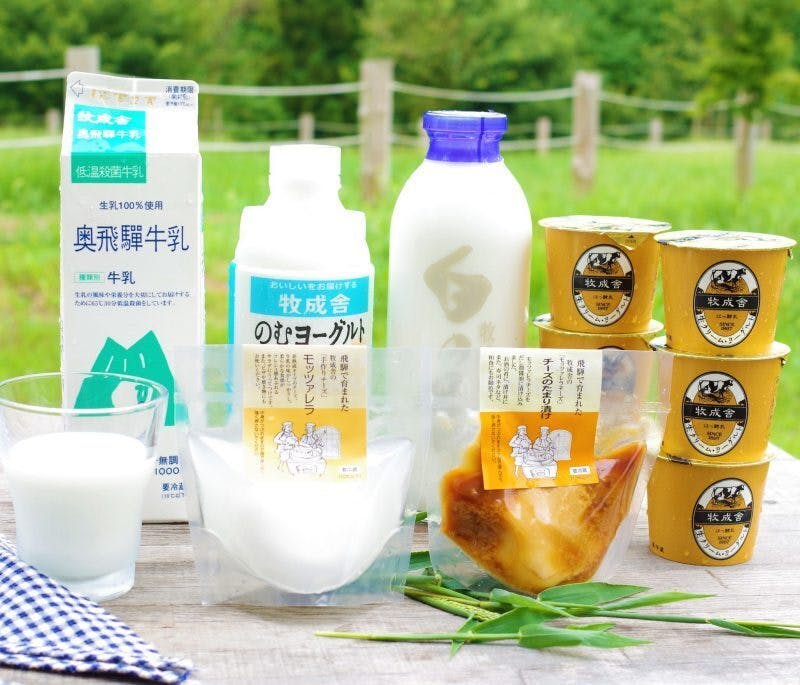 私たちが大切にしているのは、生まれも育ちも牧成舎の牛を、広い牛舎の中で動き回れるストレスフリーな環境下で、牛たちの尊厳や健康も考えて育てること。そんな健康的な牛から搾った新鮮な生乳は、甘くてサラッとした口当たりが特徴です。そして、牛乳以外の製品も素材の味を生かして出来るだけ添加物は加えず作っています。