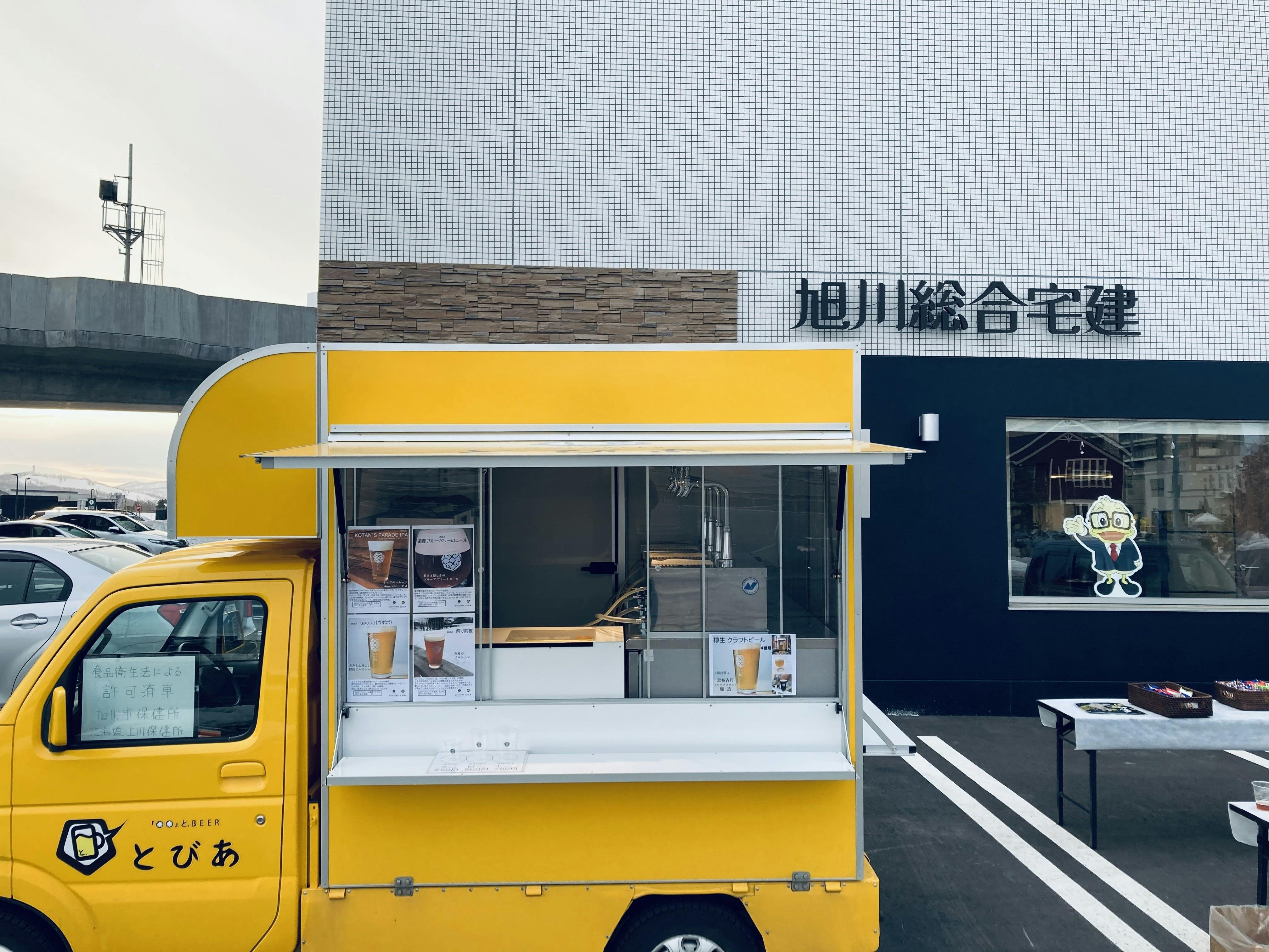 『旭川総合宅建』さまの店舗は、北彩都のかなり目立つエリアにありまして、「とびあ」のキッチンカーを見かけた通りすがりの車の視線をビンビン感じていました…!