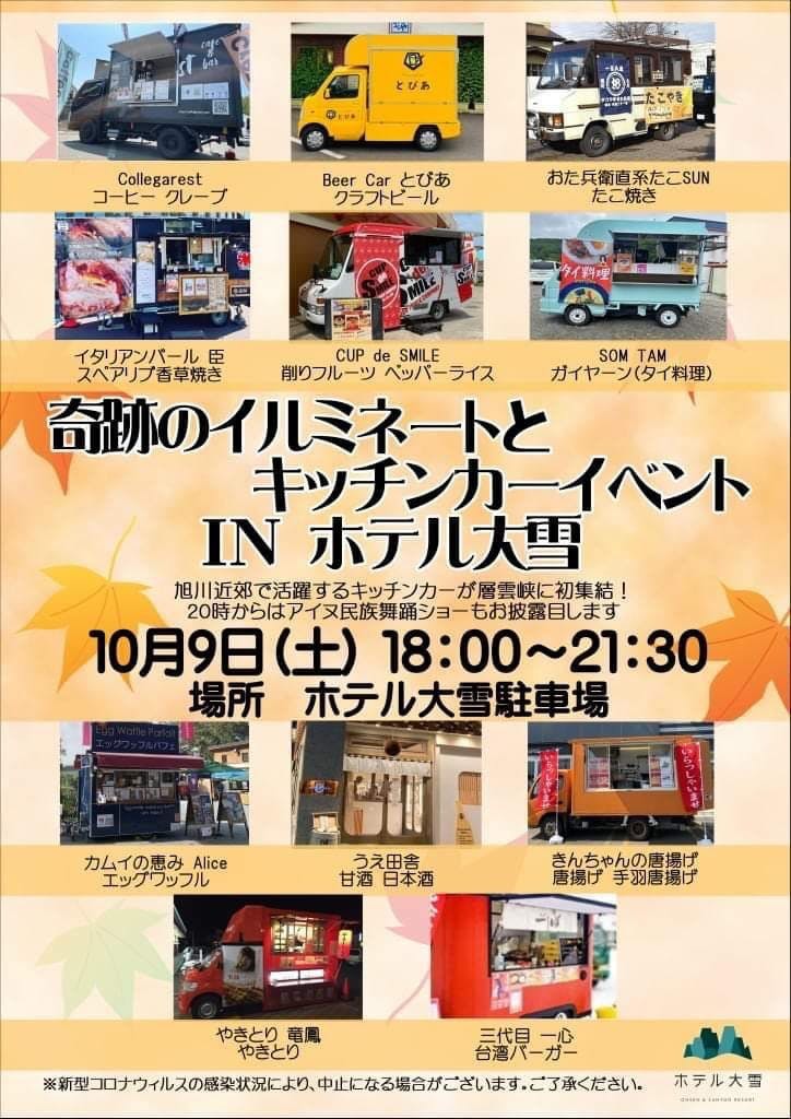 『ホテル大雪』さまの主催で、添付画像のキッチンカーが層雲峡に集結いたします。