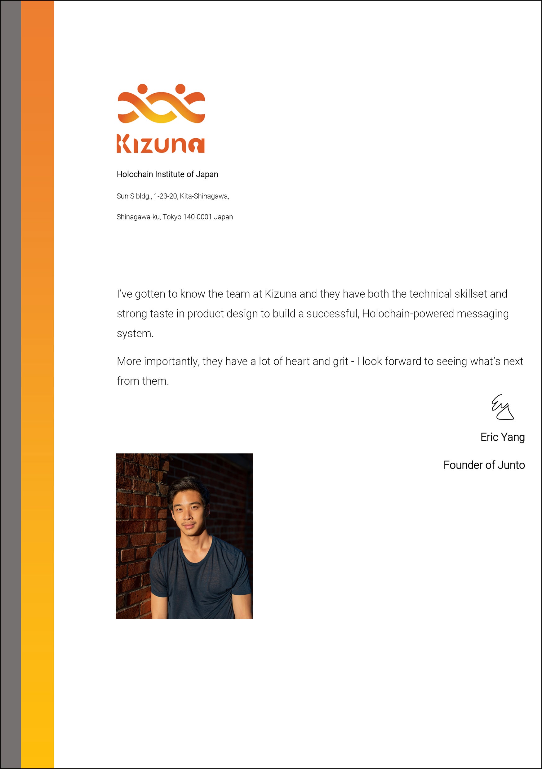 世界クラスの設計思想に共鳴した国内外の若き起業家の応援を得て、真の安全・安心を目指し、Blockchainの次世代技術と欧米では称されているHolochain(ホロチェーン)技術により、「通信の秘密」という概念をメッセージングアプリ「Kizuna」により再構築します。
