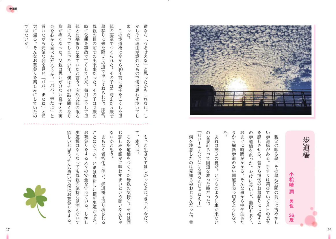 まもなく老朽化に伴い、歩道橋は取り壊されることになった。今は真新しい横断歩道ができ、お墓参りをする人々の安全を守っている。しかし歩道橋はなくなっても母親の気持ちは消えないで欲しいと思う。そんな思いで僕はお墓参りをする。