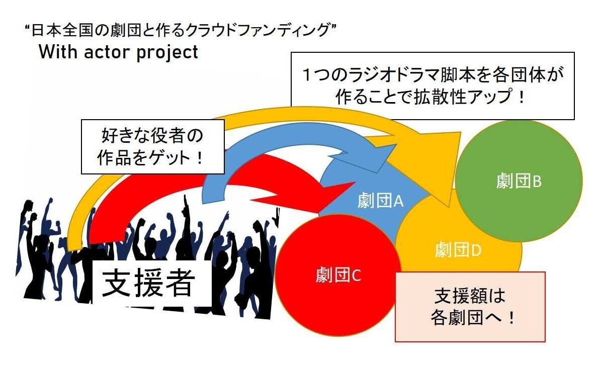 そこで私は「With Actor Project」という、1つのオーディオドラマを各劇団で作るイベントを発足しました。支援者様は自分の好きな劇団の作品をゲットすることができます。そして、その支援額は選択された団体へ全額お送りいたします。