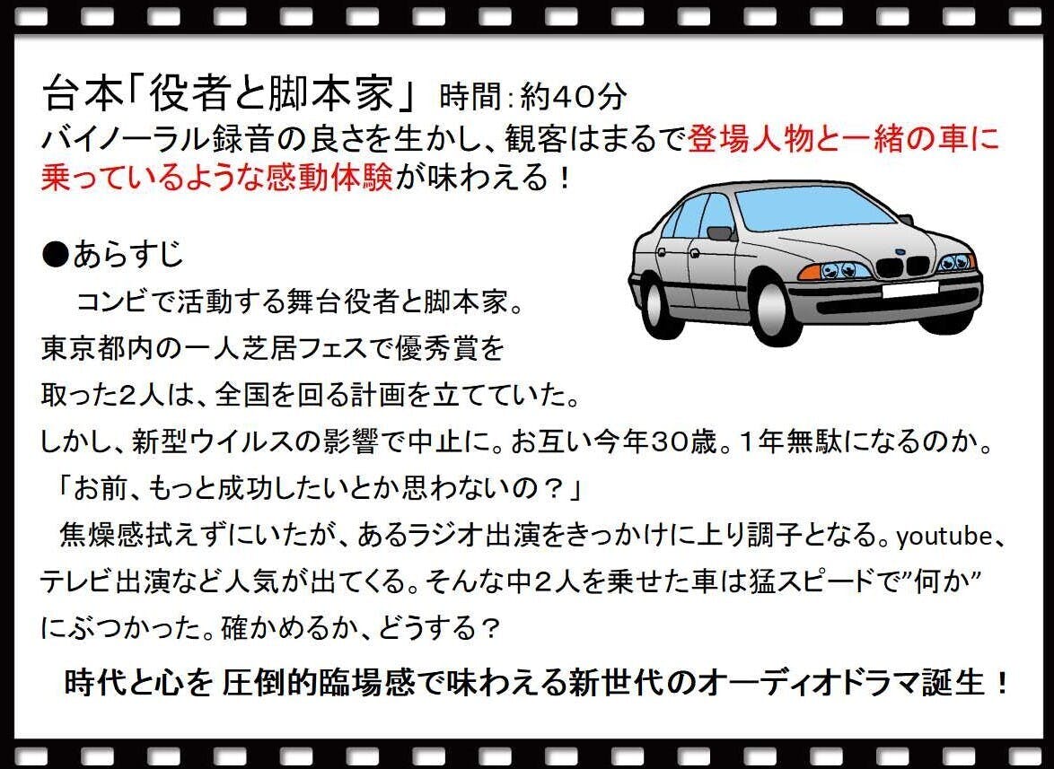 2020/09/02 18:22コロナ禍で全国の劇団が工夫をこらし活動していますね劇団須藤兄弟は9月19~21日、”カーシアター野外劇”を上演いたしますもともと毎年ゴールデンウイークに上演していた恒例の野外劇ですが、今年は新型ウイルスの影響で延期していました。そこから立ち上がり、「お客様は自身の車で来場。車内で観劇」というカーシアター形式をとった野外劇へ挑戦することが決定!ぜひ、歌ありダンスあり大道芸あり! 生の野外劇をご堪能ください!予約や詳細はこちら↓https://tabica.jp/travels/24025?prcd=V5dE もっと見る台本「役者と脚本家」の内容は? バイノーラル録音って?