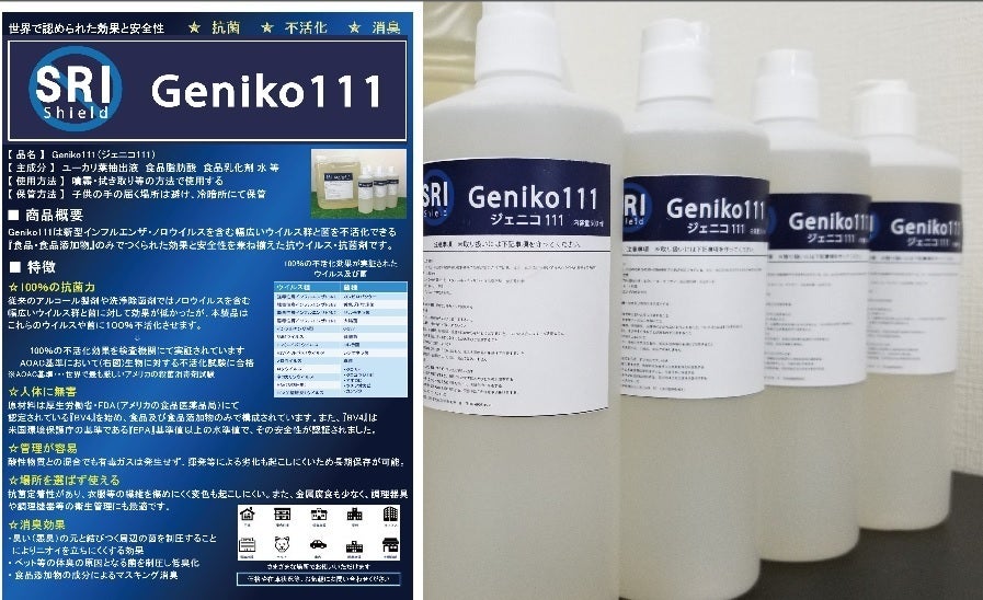 ※「Geniko111」及び「Geniko Zero」を含むGenikoシリーズは人体に直接噴霧或いはかけて直接使用するものではありません。また全てのウィルスや菌に対して100%の除菌・抗菌力を保証できるものではありません。