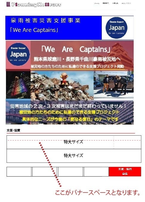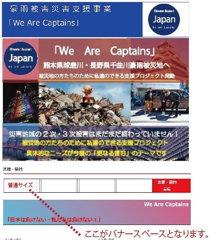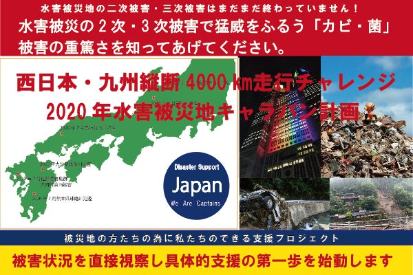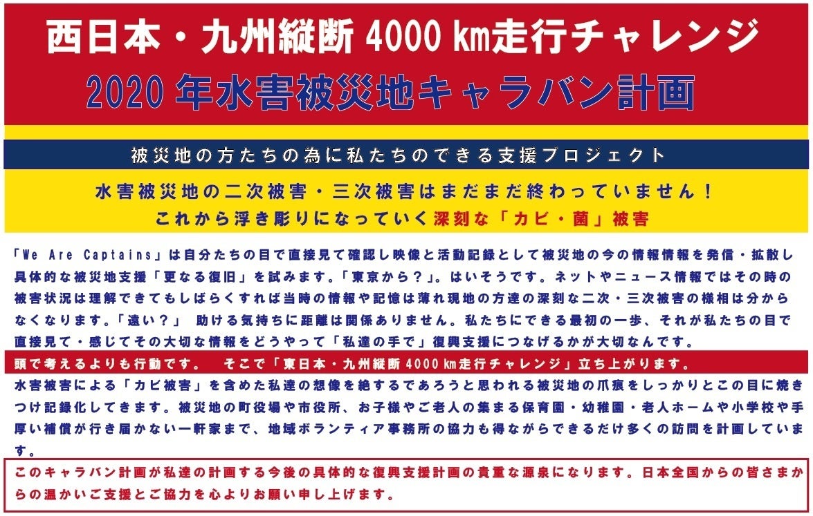 最後になりますが、私たちは普段から劣悪な「カビ・菌」被害問題に取り組んでいます。私たちのサービスの手の届かない場所は関東でもたくさんありますが、今年全国を襲った未曾有の豪雨被害は皮肉にもコロナ禍の感染問題と経済不況との打撃に乗じてしまいました。日本全土が未来と明日の希望を失っている中だからこそ私たちのような弱小者が一歩踏み出す「勇気」と「行動」が問われていると思いこのチャレンジに至りました。 このチャレンジが始まりであって私たちの目指す「復興支援」でのゴールではありません。 「We Are Captains」 主役は一人一人という意味です。その一人として重責ではありますが道を拓いていきたいと思っていますので皆様方からのご支援を心よりお願い申し上げます。