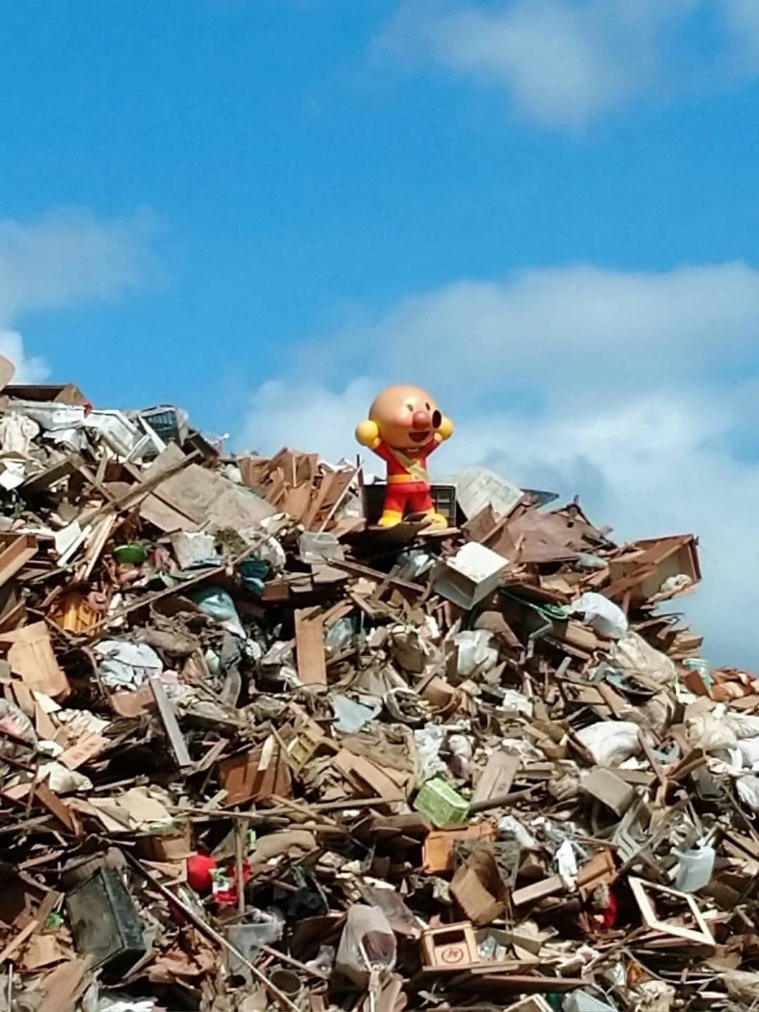 壊滅状態の街を地元の人達や日本中から集まったボランティア活動の人達が総出で徐泥活動や整備作業に汗まみれ、泥まみれになりながら作業をするんです。尊い命を失ってしまったそのご家族の方達、生きる希望すら失ってしまった人達が水害によって壊滅してしまった街を、復興支援作業をしている彼らを見守るなか、その彼らがその日の作業を終えこの瓦礫の上にのせたのが最後の写真のアンパンマンだったんです。