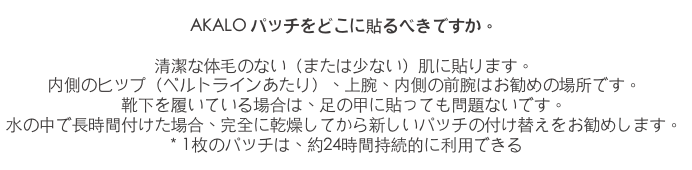 A : もちろん乾燥したスキンに貼ることが一番オススメですが、AKALOパッチは水の中でも利用できる防水素材をしておりますので、水泳やシャワーの時に利用しても問題ありません。