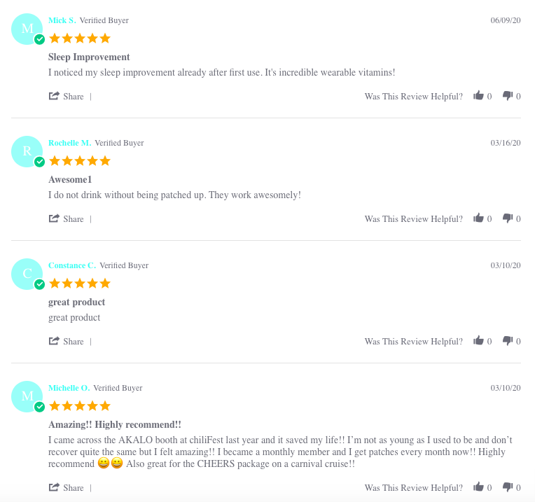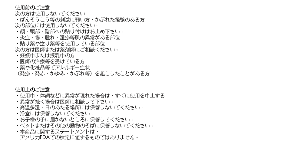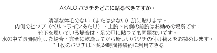 A : AKALO B1パッチの場合、飲酒前または飛行機乗る前に貼ることが一番オススメです。AKALO D3パッチの場合、何時貼ってもいいですが、就寝前に貼ると寝ている間に持続的なビタミンD3補充により、睡眠品質につながるので一番オススメです。