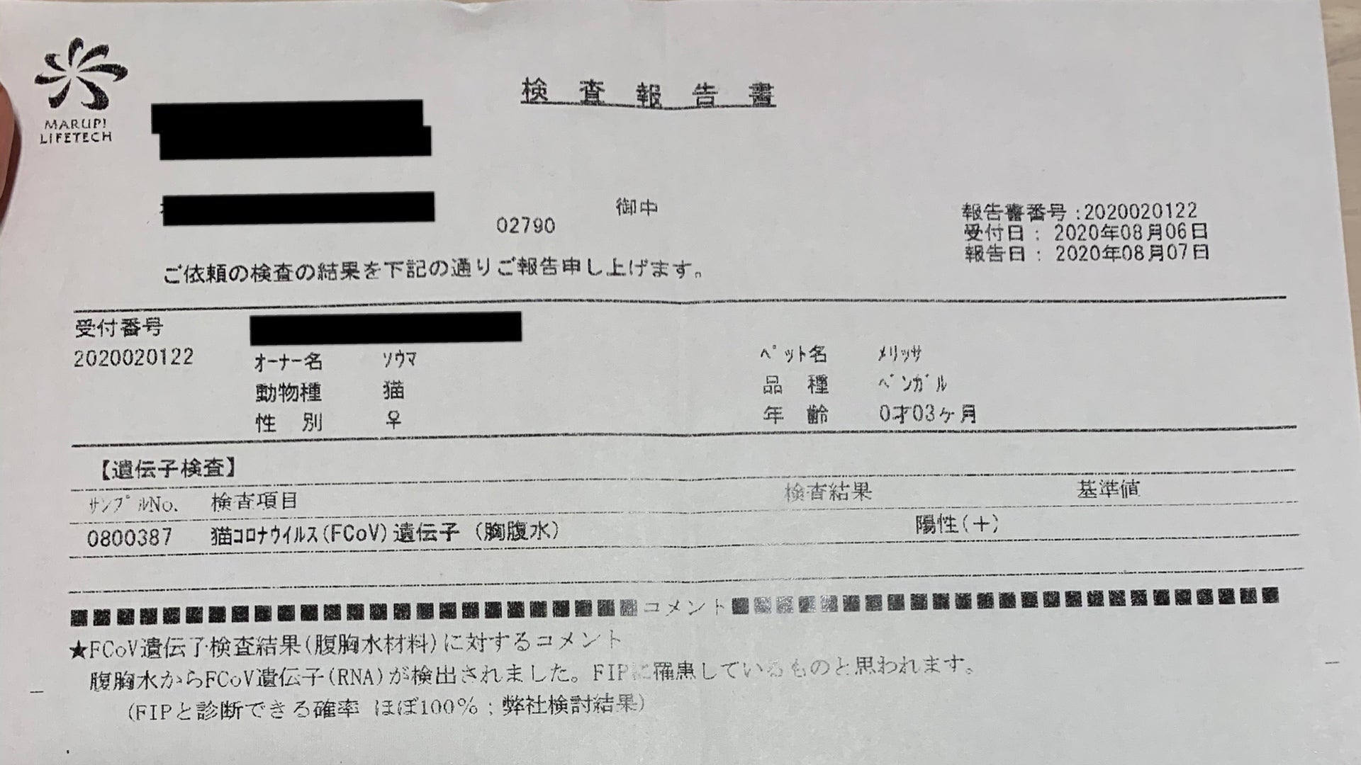 猫伝染性腹膜炎(FIP)と診断されました。
