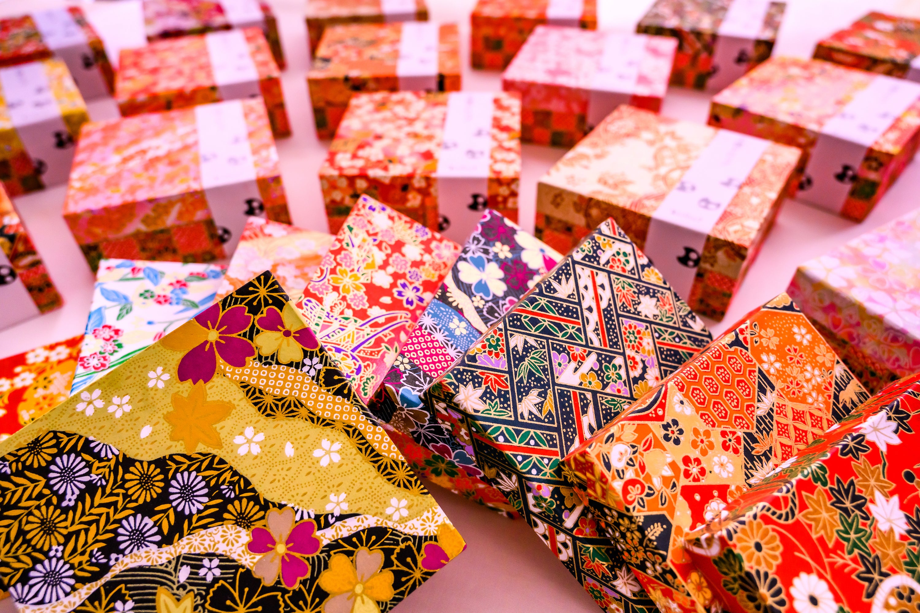 こちらは木材メーカー様からしっかりとした木箱を仕入れ、友禅和紙を一枚一枚綺麗に手作業で張り付けして仕上げた、見た目が本当に綺麗な箱となっております。