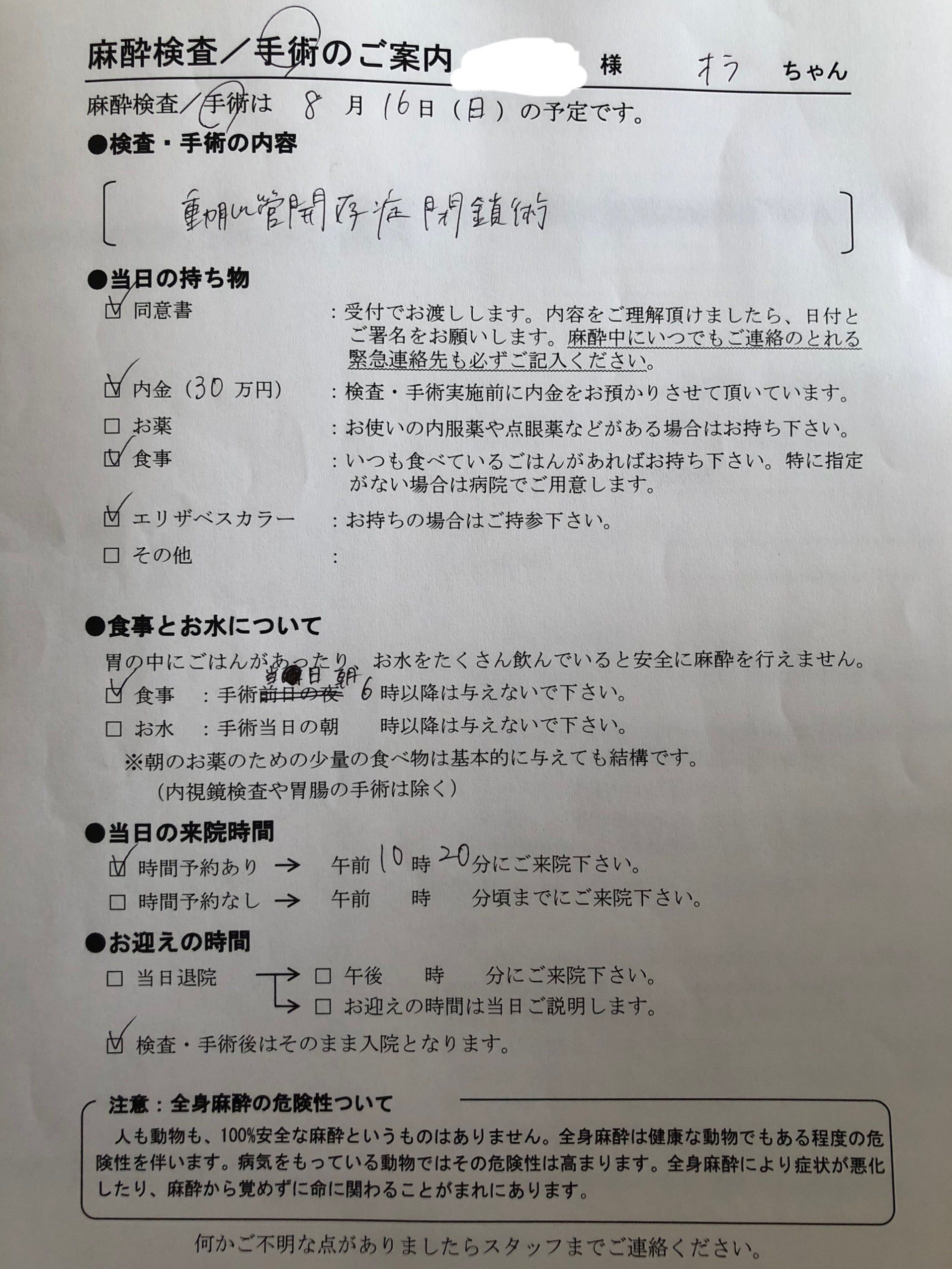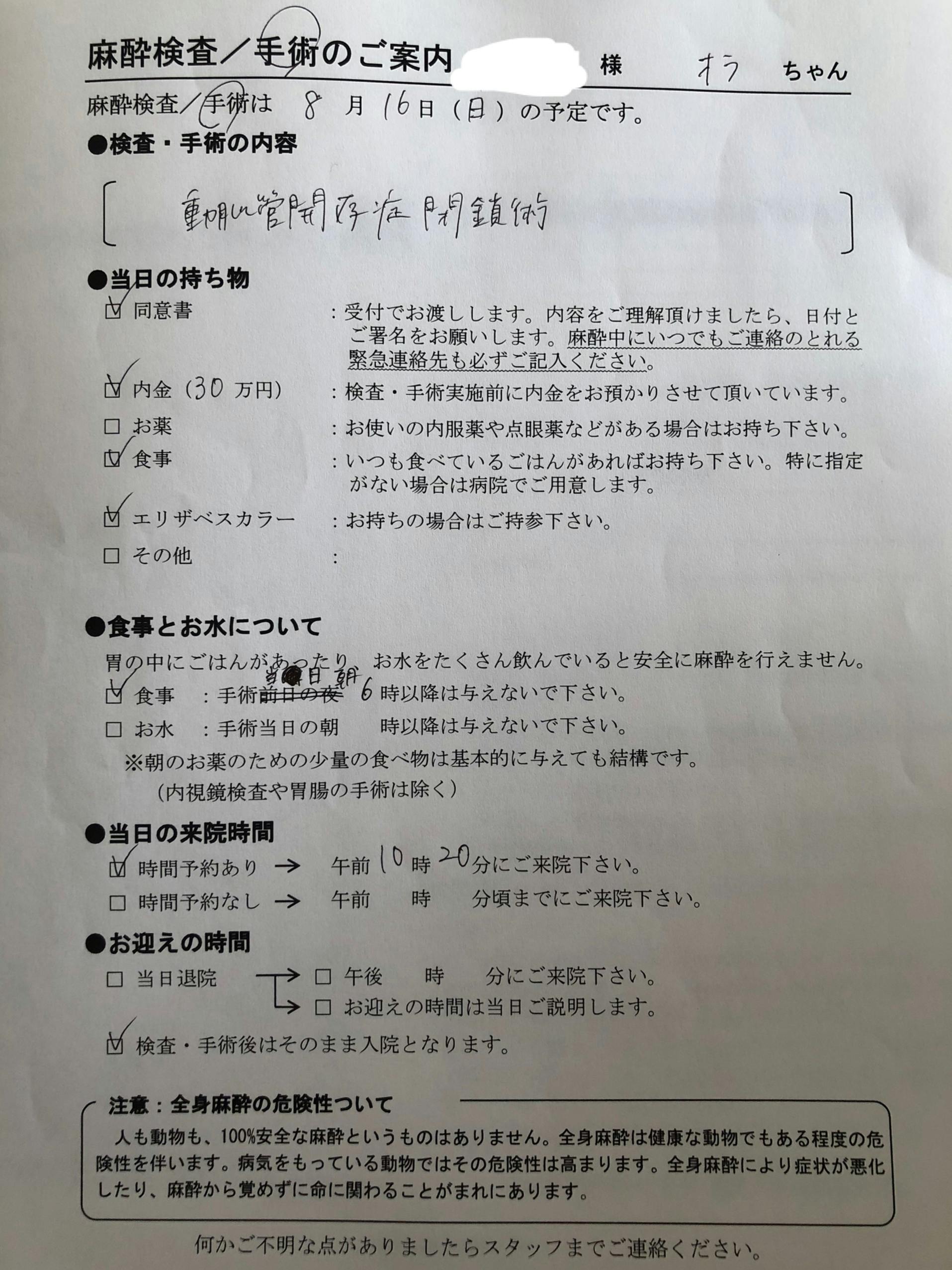 オラは2020年5月26日生まれの男の子です。心雑音4、廃棄処分予定との事で埼玉県にある保護センターから家族として迎えました。センターの方からのお話では、半年後に心臓の検査をしてくださいとの事でしたが、自宅に来てからもゲージで休んでいる事が多く、呼吸数が90回と多くなることから、8月4日に病院を受診し、動脈管開存症、心肥大、その事による合併症で、肺水腫になっている事がわかりました。先生からは手術以外助かる道はないとの事でした。肺に溜まったお水も多く呼吸も苦しい為、なるべく早い段階で手術を受ける事を提案されました。1番早く手術が受けられる日が8月16日で、そこから8月20日までの入院となります。手術費用や現在内服しているお薬、検査費用が高額のためオラの命を守るために皆さまにご協力お願いしたくこちらに載せさせて頂きました。是非ご協力よろしくお願い致します。
