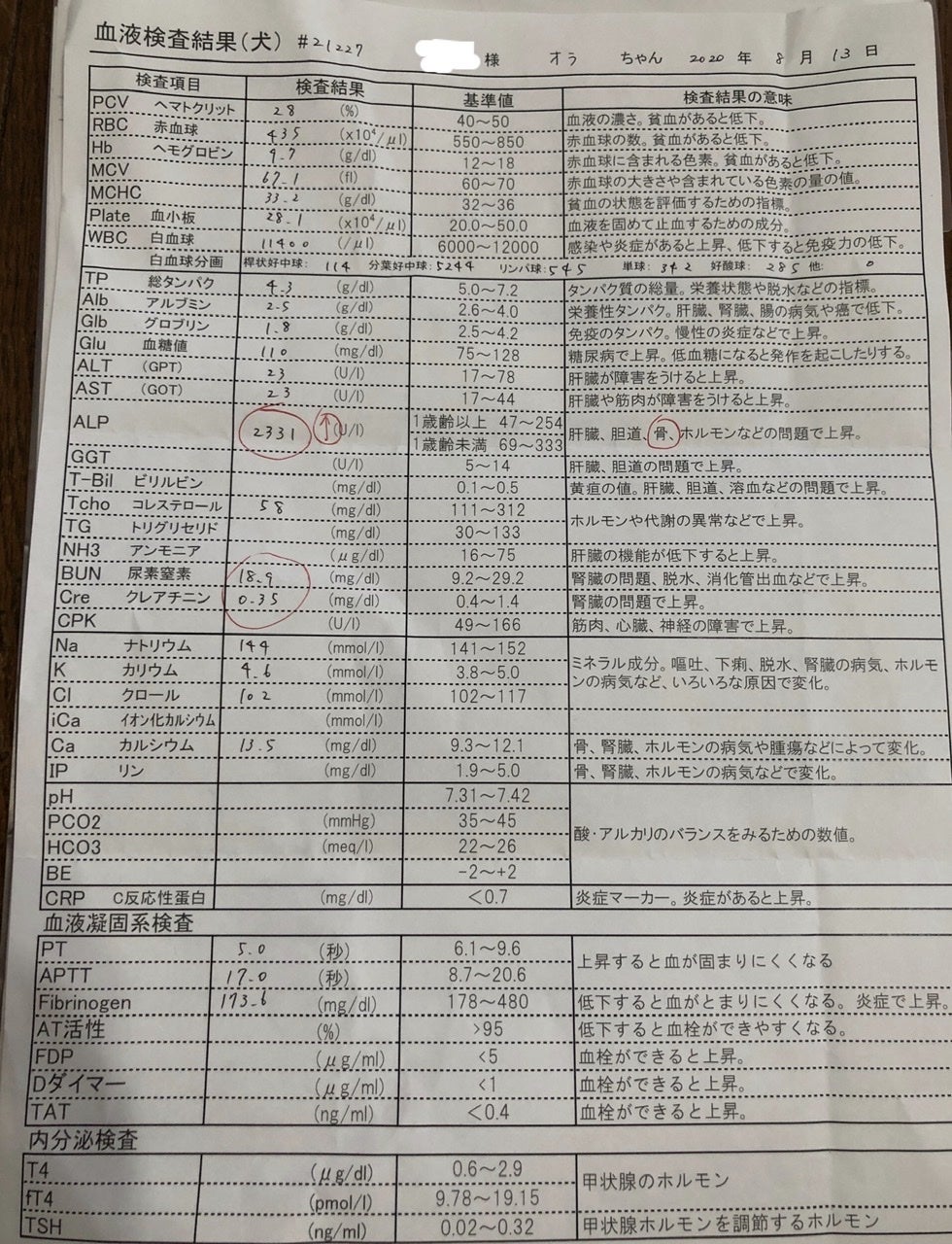 胸部レントゲンは、内服薬の効果が出ていて少し心肥大が改善しているが、肺には変わらずお水が溜まってしまっている肺水腫の状態との事でした。