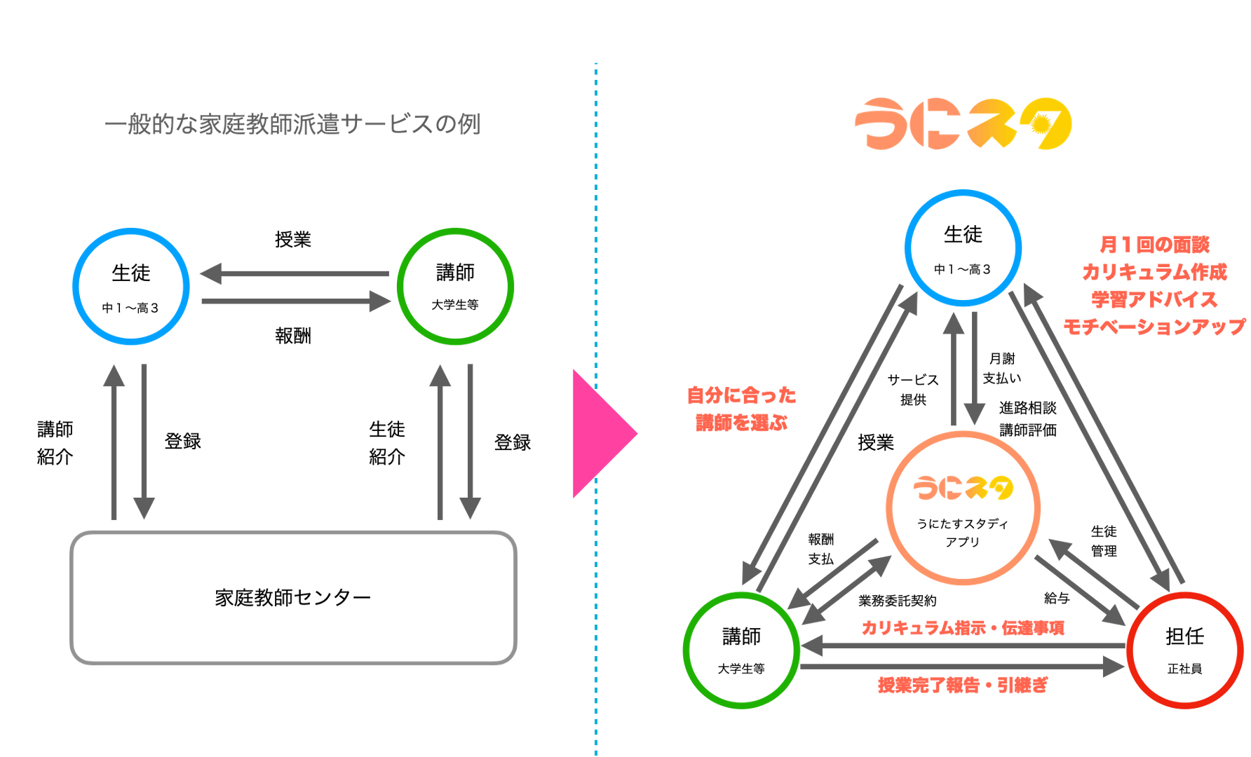 そこで家庭教師なら、密にならないですし家庭教師の仕事を探している大学生の助けになるんじゃないかと、自らの7年間の指導の経験でたどり着いたメソッドを落とし込んだ家庭教師サービス「うにたすスタディ」を立ち上げました。