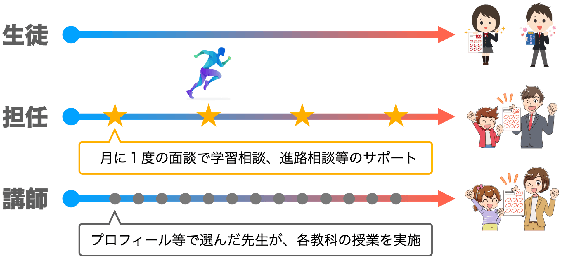 講師は各教科の授業を実施し、担任は月に一度の面談で学習相談や進路のサポートをします。