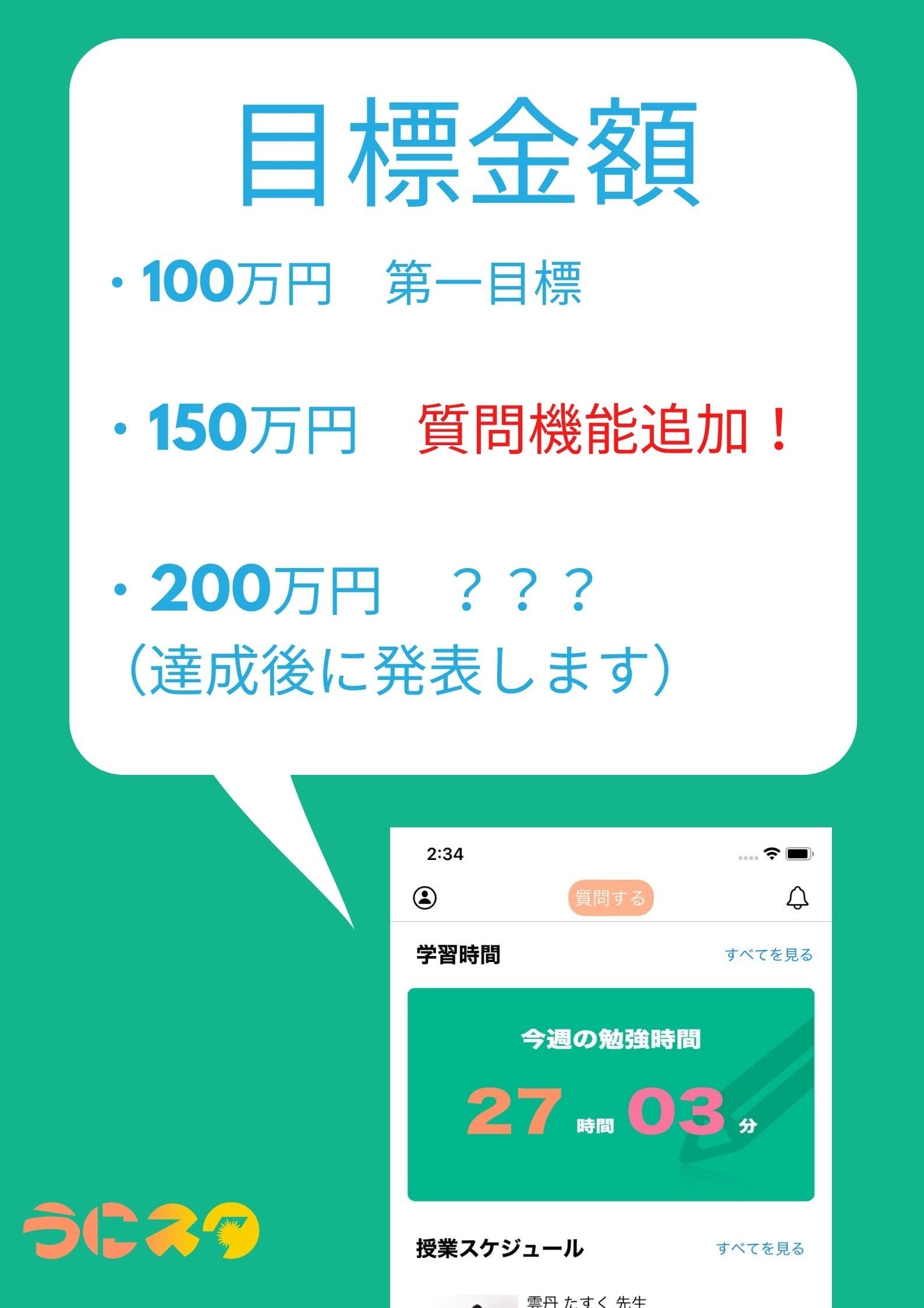 今回プロジェクトを立ち上げたのは、このうにたすスタディのアプリの開発資金を募るためです。すでにアプリの開発はスタートしており、自費でも製作することは決まっています。