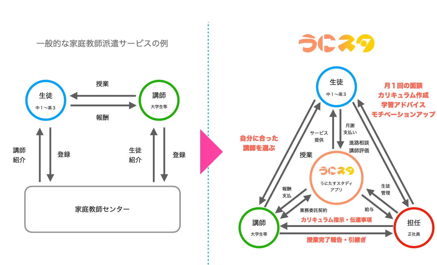 この「うにたすスタディ」は、「教科を教える講師に加え、担任が生徒の目標達成をサポートする」新しい家庭教師のサービスです。