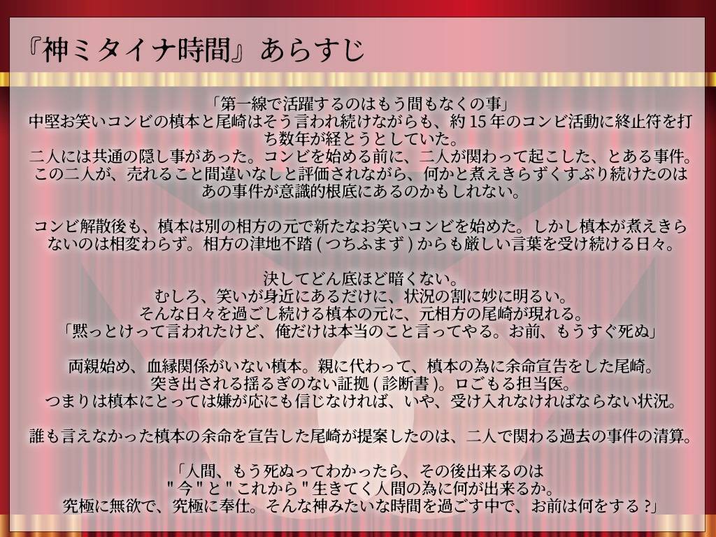 しかしながら、この『神ミタイナ時間』を演劇という形でも、必ず改めてお送りしたいと思っております。