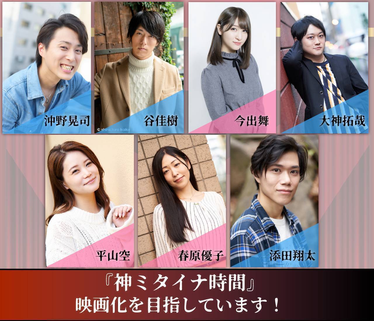 2021/10/21 21:2910月公演中止に伴う劇団存続の為の支援と中止舞台作品映画化の為の支援プロジェクトへのご支援。誠に有難うございます。間も無く舞台『神ミタイナ時間』上演が始まります!!本作は、昨年10月舞台にて上演予定だったボクラ団義の舞台作品を、クラウドファンディングプロジェクトを経て、舞台版から映画作品化したものです。その映画作品の劇場公開を10月22日〜予定している中、この映画版を、更に舞台版として上演いたします!!……………………………企画演劇集団ボクラ団義 vol.23-死ぬのが決まってるような人間にしか 出来ない事やらせてくれ−舞台『神ミタイナ時間』作・演出 久保田唱・キャスト【bokura-dangi】沖野晃司大神拓哉平山空春原優子添田翔太福田智行内田智太高橋雄一花崎那奈緑谷紅遥大音文子【guest】谷佳樹今出舞吉田宗洋・公演スケジュール2021年10月27日(水)~31日(日)10月27日(水)18:0028日(木)13:00/18:0029日(金)18:0030日(土)13:00/18:0031日(日)14:00(全7回公演)※収録回…28日(木)13:00/18:00※配信回…28日(木)18:00開場は開演時間の45分前、受付開始は1時間前です。☆来場者特典【キャストボイス】プレゼント!ご来場頂いた全てのお客様に、『キャストからの感謝メッセージ』をプレゼントさせて頂きます!各回ごとに収録させて頂いたメッセージ(YouTubeによる音声のみの動画メッセージ)のQRコードを会場内に貼り出させて頂きます!ご自身のスマホなどで読み取って頂き保存する形となります。読み取りの機械が無い方、方法が分からない方はご連絡下さいませ。別の方法をご案内致します。※10月27日(水)より公演の舞台『神ミタイナ時間』を劇場にてご観劇くださったお客様へのプレゼントとなります。※プレゼントは非売品です。ご来場者への特典でございますので、転売やSNSなどでの公開は固くお断りさせて頂きます。・会場CBGKシブゲキ!!〒150-0043 東京都渋谷区道玄坂2-29-5 ザ・プライム 6階・チケット情報□前売り 6,900円(税込)□超先行予約限定ピンポイント指定席 7,900円(税込)※1□当日券 7,500円(税込)□タスケテシート 10,000円(税込)※2□ LIVE配信&アーカイブ視聴チケット3,500円(税込)※3全席指定情勢上、今公演の入場は開演の2分前までとさせて頂きます。入口での検温等、通常の公演より時間を要します為ご了承下さいませ。開演時間を過ぎてのご来場のお客様は、開演後係員の指示に従って頂きご入場となります。また上記の事から、開演10分前を過ぎてご来場の場合も、指定のお席にご案内出来ない場合がございます。お早めのご来場をお願い致します。※1 超先行予約予約期間:2021年9月4日(土)21時~9月10日(金)23時59分超先行予約のみの販売です。カンフェティより“全座席”の中から、お好きなお席を“ピンポイント”でご予約頂けます。※2 タスケテシート座席自体は、前売り予約でご予約頂ける席と差はありません。名前の通り、「タスケテ」の気持ちでこの券種を作らせて頂きましたが、こちらをお選び頂かなくてもご予約頂けるだけで十二分に感謝しております。せめてもの気持ちで、予約特典としてボクラ団義メンバー全員の直筆サイン付きポストカードをつけさせて頂きます。何件ご予約頂いても必ず直筆で書かせて頂きます。※3 配信3カメスイッチングでの配信でございます10月28日(木) 18:00回の公演の生配信から、アーカイブ配信として2週間、11月11日(木)18:00までご視聴いただけます。☆本作の映画化に関するクラウドファンディングで、本舞台の【超超優先予約権】を返礼品に含むコースでご支援くださった方を対象に、超先行予約が始まるまでの期間に、個別ご連絡の上、優先予約を承っております。・予約方法【観劇のご予約】Confettihttps://www.confetti-web.com/detail.php?tid=62694【配信のご予約】http://v2.kan-geki.com/live-streaming/ticket/512・予約期間☆超先行予約2021年9月4日(土)21時~2021年9月10日(金)23時59分超先行予約のみの販売です。カンフェティより“全座席”の中から、お好きなお席を“ピンポイント”でご予約頂けます。(先行特典付き)☆先行予約2021年9月11日(土)21時~2021年10月17日(日)23時59分(前売、先行特典付き)※先行特典として超先行予約・先行予約期間にご予約下さった方には劇場にて特別バージョンのチラシをプレゼント!!☆一般予約2021年10月18日(月)21時~(前売受付)☆配信予約2021年10月23日(土)12時〜2021年11月11日(木)15:00まで・あらすじ「第一線で活躍するのはもう間もなくの事」 中堅お笑いコンビの槙本と尾崎はそう言われ続けながらも長期間のコンビ活動に終止符を打ち、数年が 経とうとしていた。コンビ解散後も、槙本は別の相方と新たなお笑いコンビ組んだが、煮えきらないのは相変わらず。相方の 津地不踏(つちふまず)からも厳しい言葉を受け続ける日々。そんな日々を過ごし続ける槙本の元に、元相方の尾崎が現れる。「お前、もうすぐ死ぬ」診断した昔馴染みの医者に代わって、槙本の為に余命宣告をした尾崎。突き出される揺るぎのない診断書。自分の残り少ない余命に愕然とする