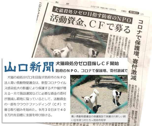 2021/08/10 11:168月2日からスタートした「殺処分から命を守り切る」ためのクラウドファンディング。10日目を迎え、皆様のご支援のお陰で目標額400万円の23%に達しました。活動拠点山口県の新聞も応援して記事にして下さいました。これをご覧になった方からも早速メッセージとともにご支援をいただきました。スタート以来毎日 熱いエールを送って頂いております。コロナ禍で殺処分ゼロの継続が危機を迎えています。どうか皆さまのご支援を賜りますようお願い申し上げます。 https://readyfor.jp/projects/aoitori-aigo-2 もっと見る