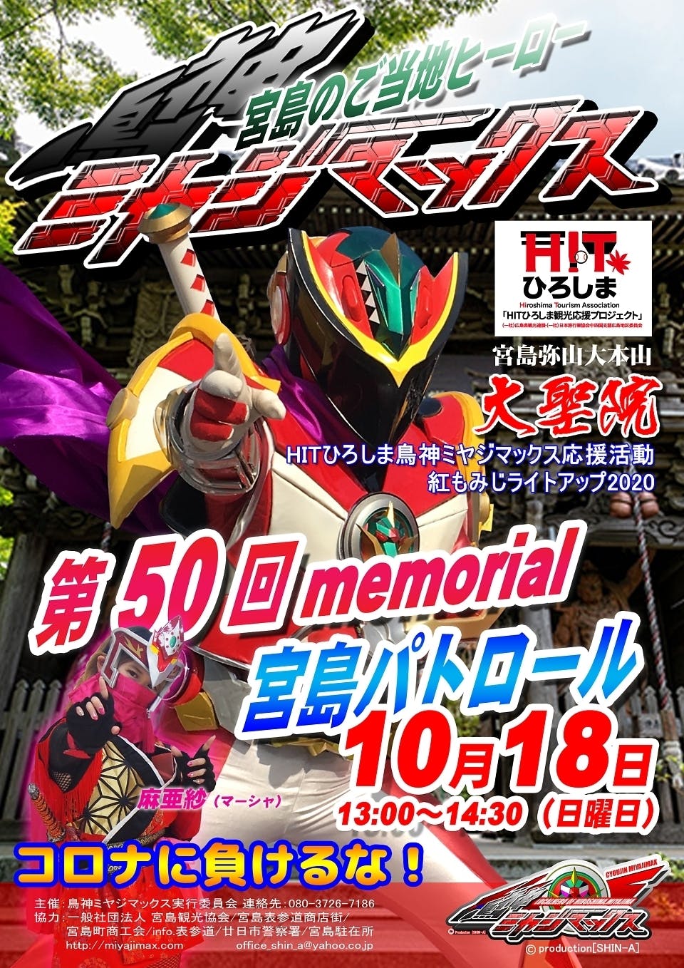 ということで、月に1度、世界平和を宮島から発信する平和パレード「宮島パトロール」も50回を迎えましたが、この記念すべき回で、宮島大聖院 様に 鳥神ミヤジマックス初見参することになりました!HITひろしま観光応援プロジェクト、鳥神ミヤジマックス応援活動ということで 大聖院様のHITひろしまプロジェクト「日本三景安芸の宮島大聖院で紅葉のライトアップを楽しもう!」を応援してきます!