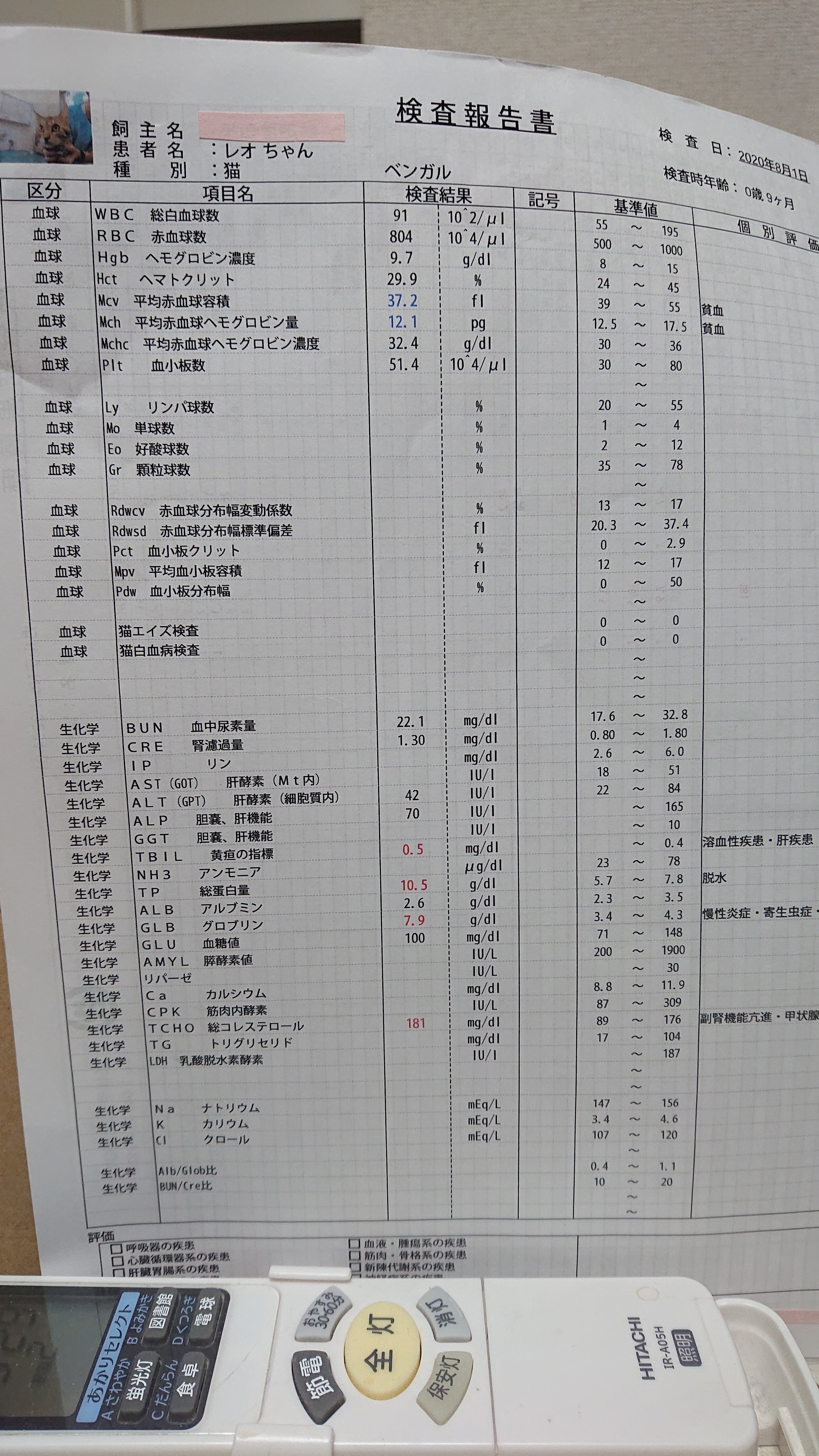 2020/11/28 18:09【病院受診】本日は投薬終了後1ヶ月後の受診でした。(経過観察31日目)11時に動物病院到着。獣医師に1ヶ月の様子を報告する。元気も食欲もあり、排泄も問題なし。ただ、良くくしゃみをするのが気になると報告する。くしゃみの回数が多く鼻汁が黄色の様なものなら猫風邪と思われるが、現在のレオは特に肺の音も問題ないし、目も鼻も綺麗だと、また成猫になったので猫風邪もよほどの事がないと酷くはならない、水っぽい鼻水やくしゃみが時々の頻度の時はアレルギー(花粉やハウスダスト)の可能性の方が高いですとの事でした。体重測定、血液検査、エコー検査施行する。体重 5.06 kg【血液検査結果】白血球、ヘマトクリット、ALB、GLOB、A/Gは問題なし。TPが若干高いが、猫風邪等でも上がる。体重減少、活動力の低下がない様子なので、心配しなくても大丈夫です。ただ、今後に体重減少や食欲不振などが見られた場合は要注意なので直ぐに受診するようにとの事。前回のコロナウイルス検査結果は問題なし。今回も検査は行い、結果が出次第電話で報告するとの事。【エコー検査検査】特に腸に肉芽腫は見られず、他の臓器も問題なし。血液、エコー検査結果からして、経過はまずまず良好ですとの診断でした。TPが若干高いのが気になりますが、経過は良いとの事でホッとしてます。本日の診療明細は、以下の写真の通りです。次回の受診は2ヶ月後の予定(2021.1.23受診予定)です。2ヶ月後の受診で結果が良ければ寛解となりますとの事でした。2ヶ月後の受診で寛解と言ってもらえる様にしっかりレオを看て行きたいと思います。本日も車の中でも、お利口さんなレオでした。↓【支援者の皆様へ】いつもレオを応援してくださり、また温かく見守って下さって本当にありがとうございます。心より感謝申し上げます。レオは元気に過ごせています。リターンの返礼について、一部の方以外はほぼ終わりました。一部の方ですが、5,000円以上のご支援のご協力をしてくださった方で、住所の記載なくリターンの返礼品は不要との事でしたが、規定通りの返礼品の準備をしてあります。主人の方からメールを送らさせて頂きましたので、よろしければメールをご確認して頂き、お手数おかけしますが返信下さると幸いです。本当にありがとうございました。これからもよろしくお願いいたします。池田 敦子 もっと見る活動報告【10/29】経過観察期間に入りました