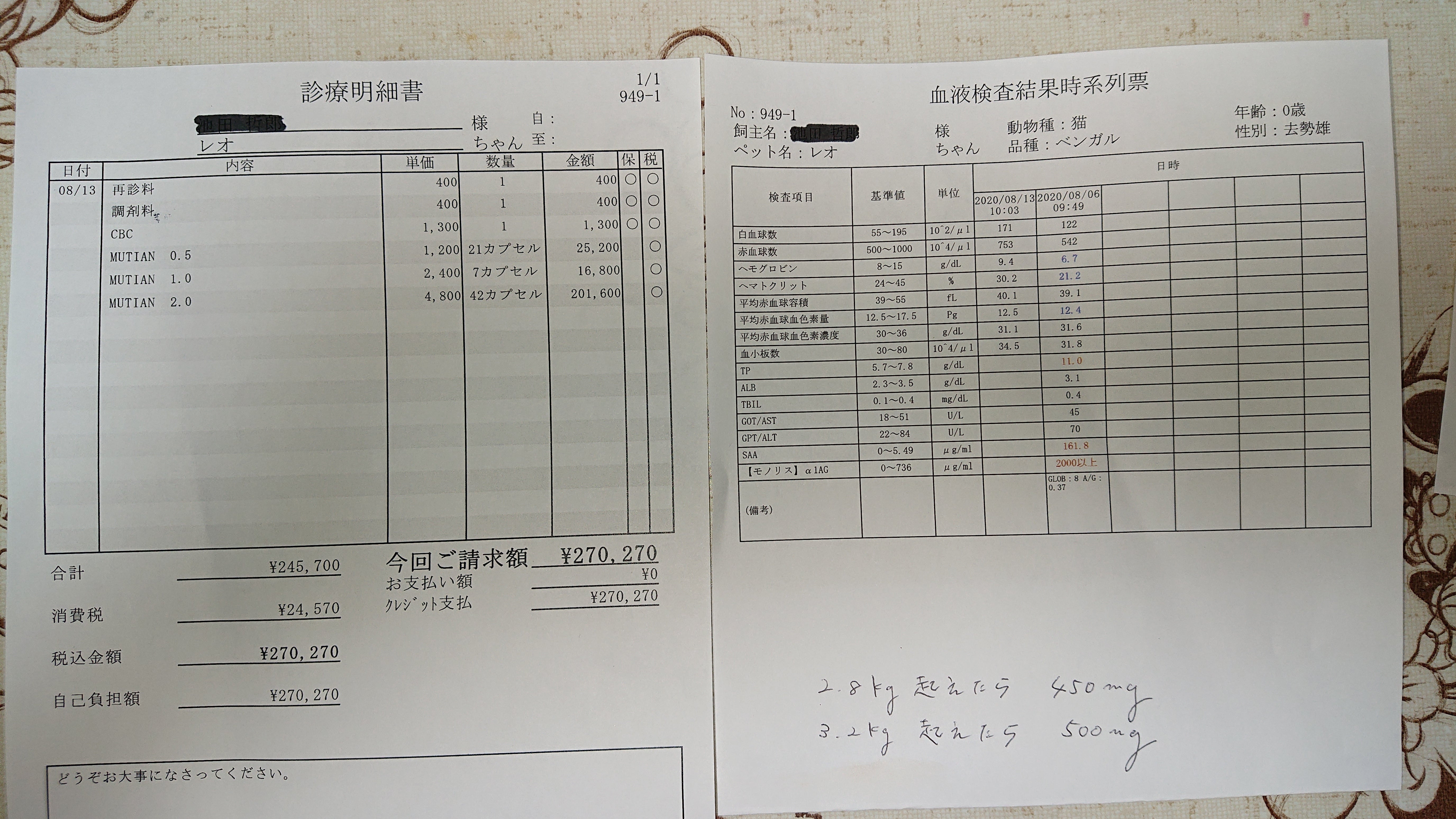活動報告で、投薬の経過やレオを状態、通院時の検査結果、診療明細等報告させていただきます。