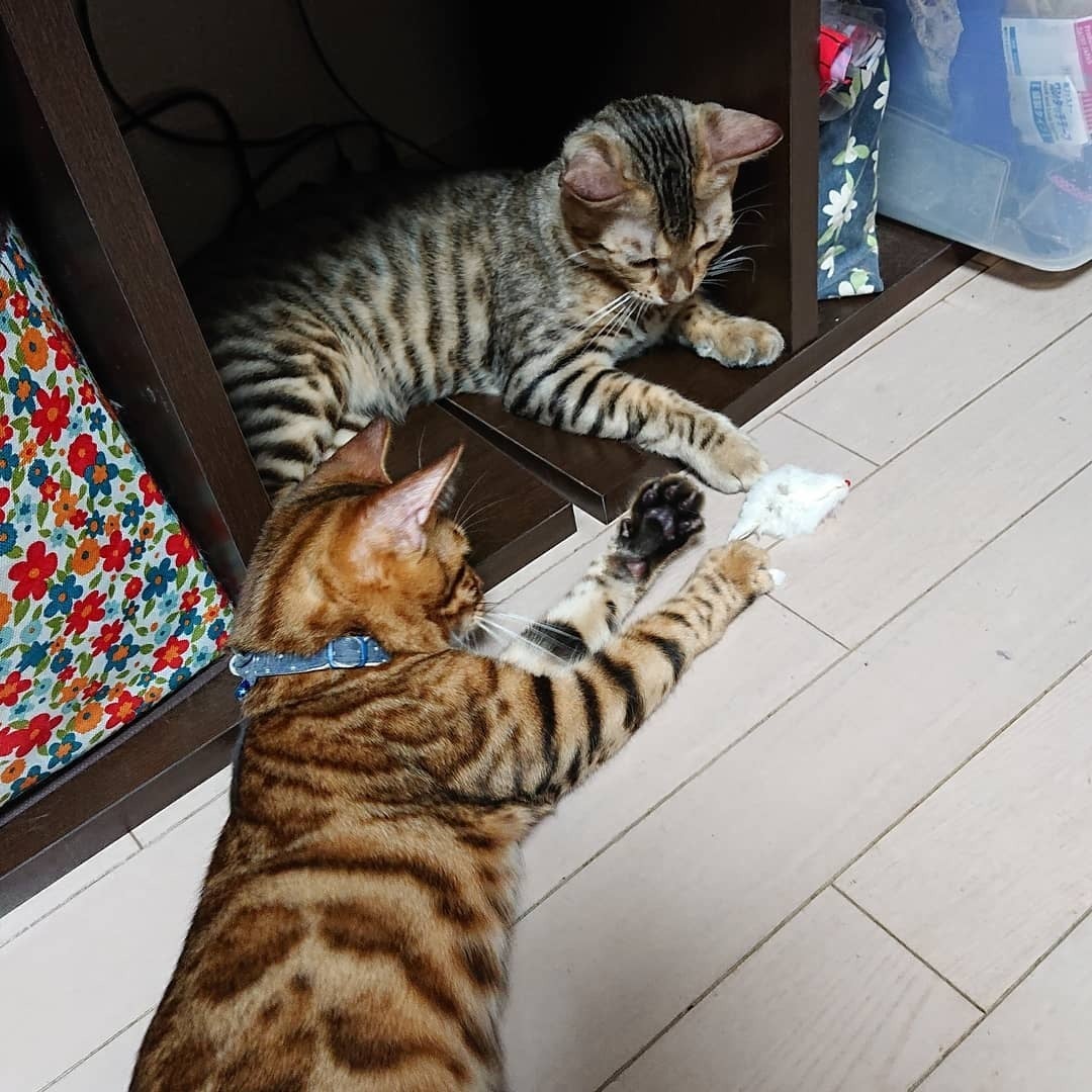 【兄弟猫でネズミさんで遊ぶ様子】