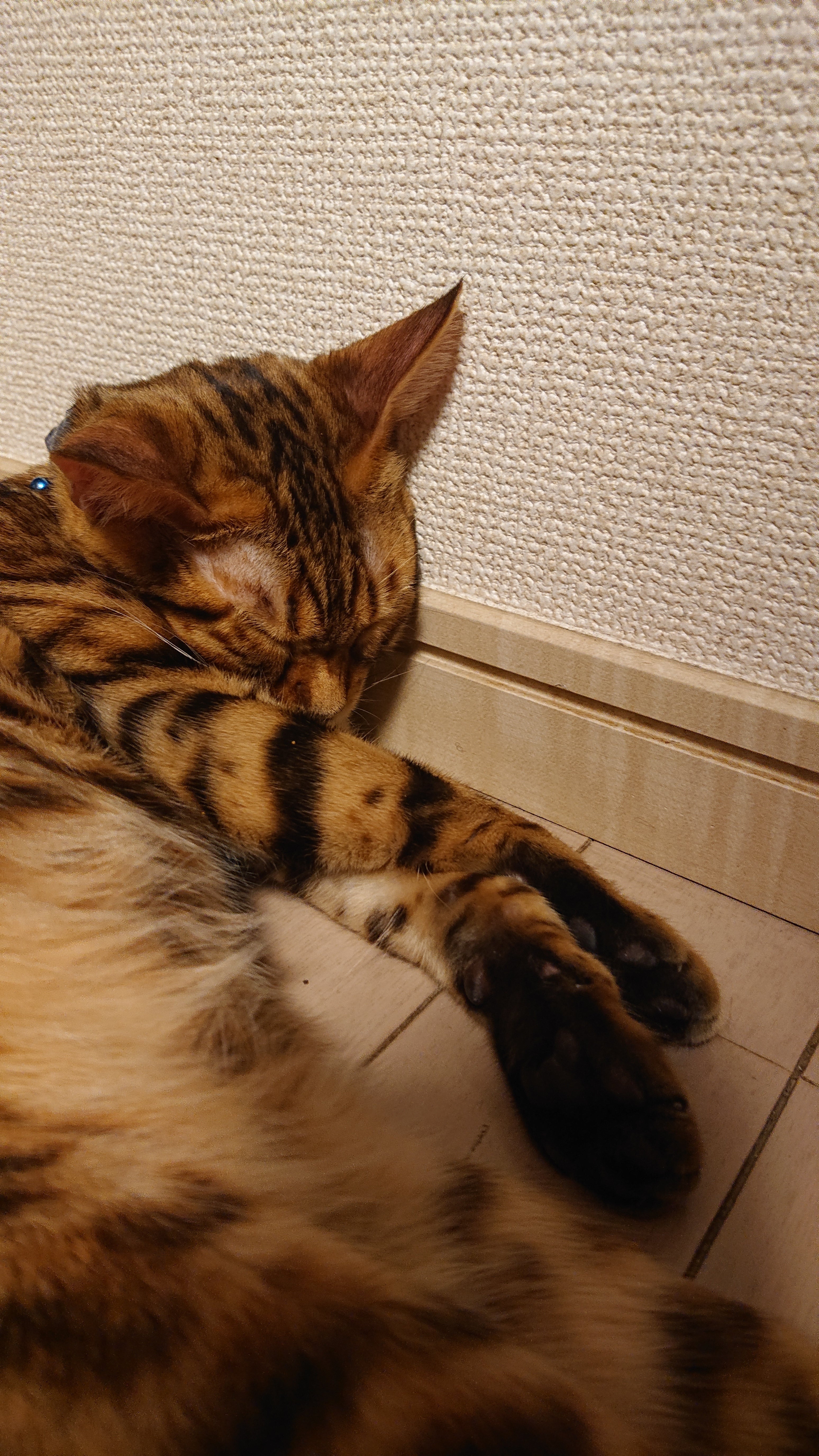 【遊び疲れ、壁に寄りかかり寝るレオ】