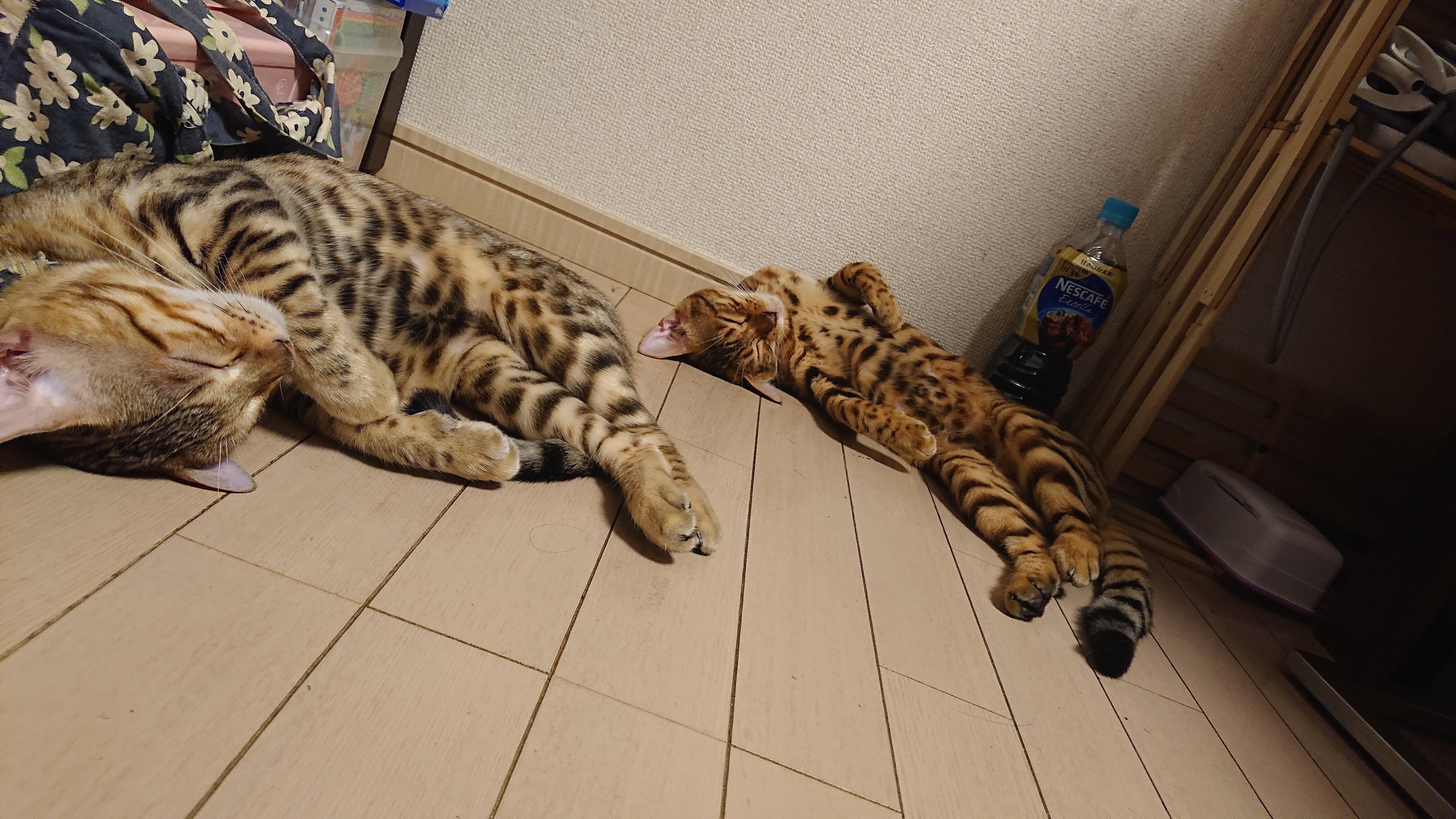 昨日のデレデレはなんだったの~と思いつつも二匹のお腹ナデナデしてあげて、兄弟のシンクロ寝相になりました。可愛いです。