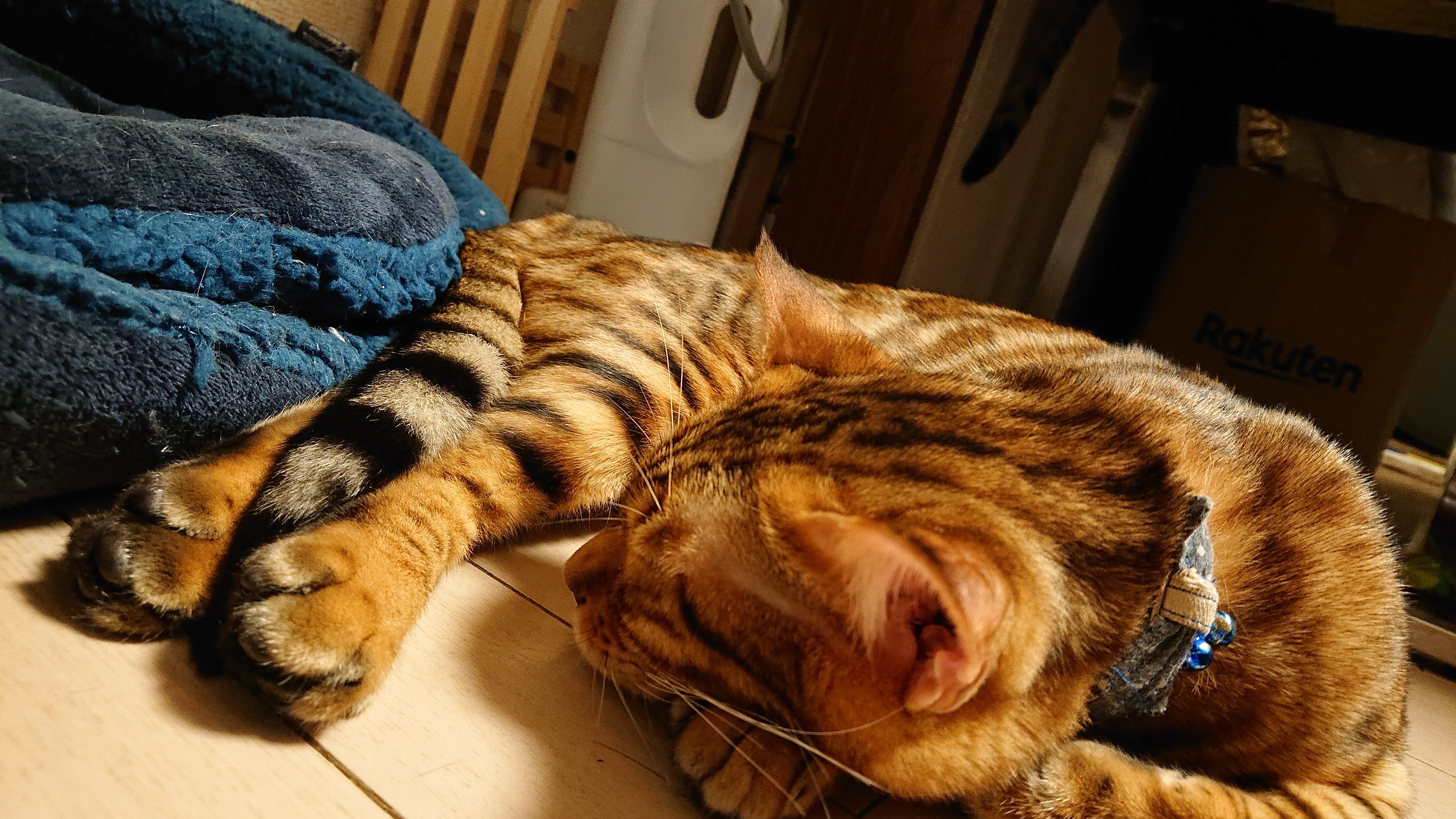 やっぱり、時間がたつとズリズリずれて床で寝ているレオ